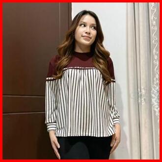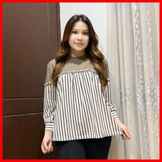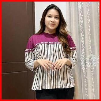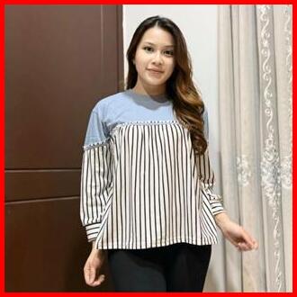 Zeeroks Baju Wanita Lengan Panjang Kominasi Salur Atasan Bahan Cotton Combed