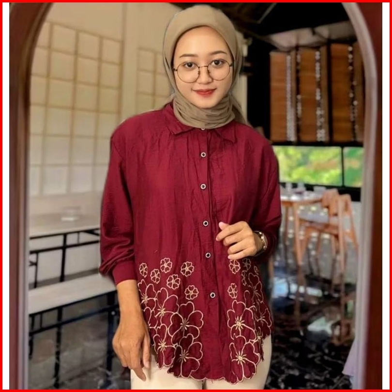 Kemeja Wanita Deanda Motif Bordir Kemeja Polo Linen Motif Bunga Bordir Kekinian Blouse Korean Kekinian