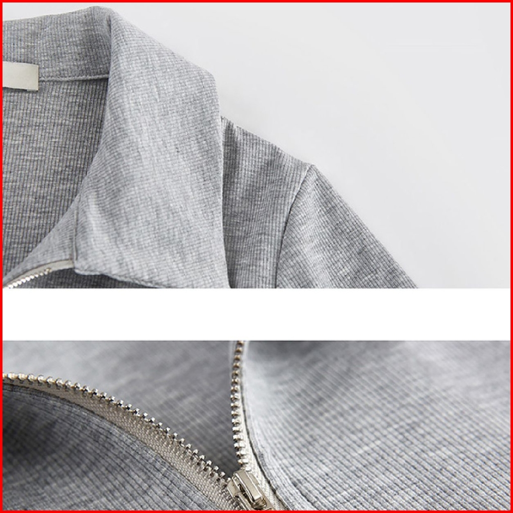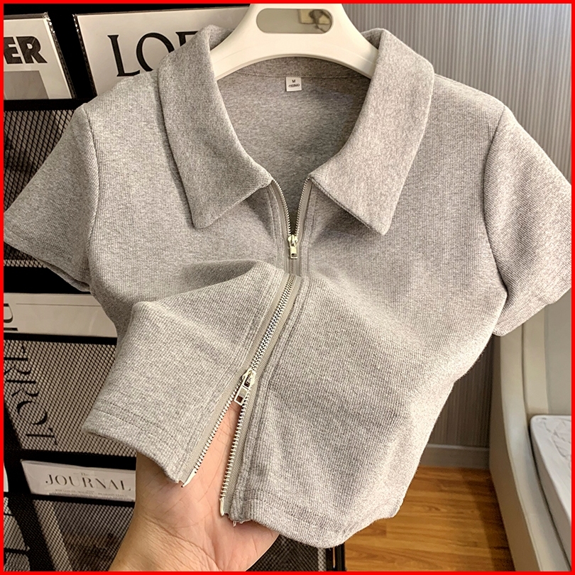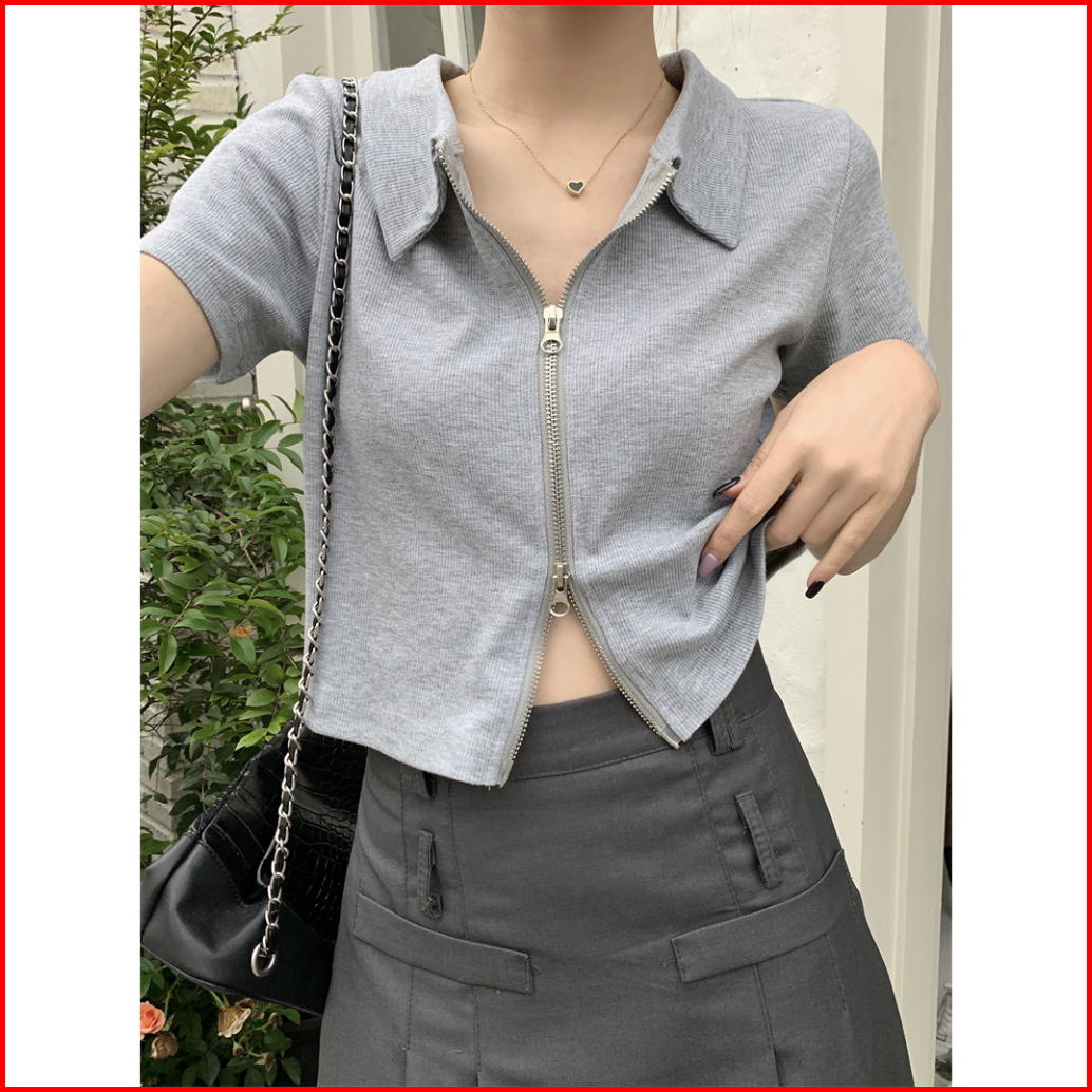 Misco T-shirt Kaos Crop Zipper Wanita Crop Top Lengan Pendek Kaos Wanita Crop Top Kardigan Warna Solid Abu-abu Kaus Crop