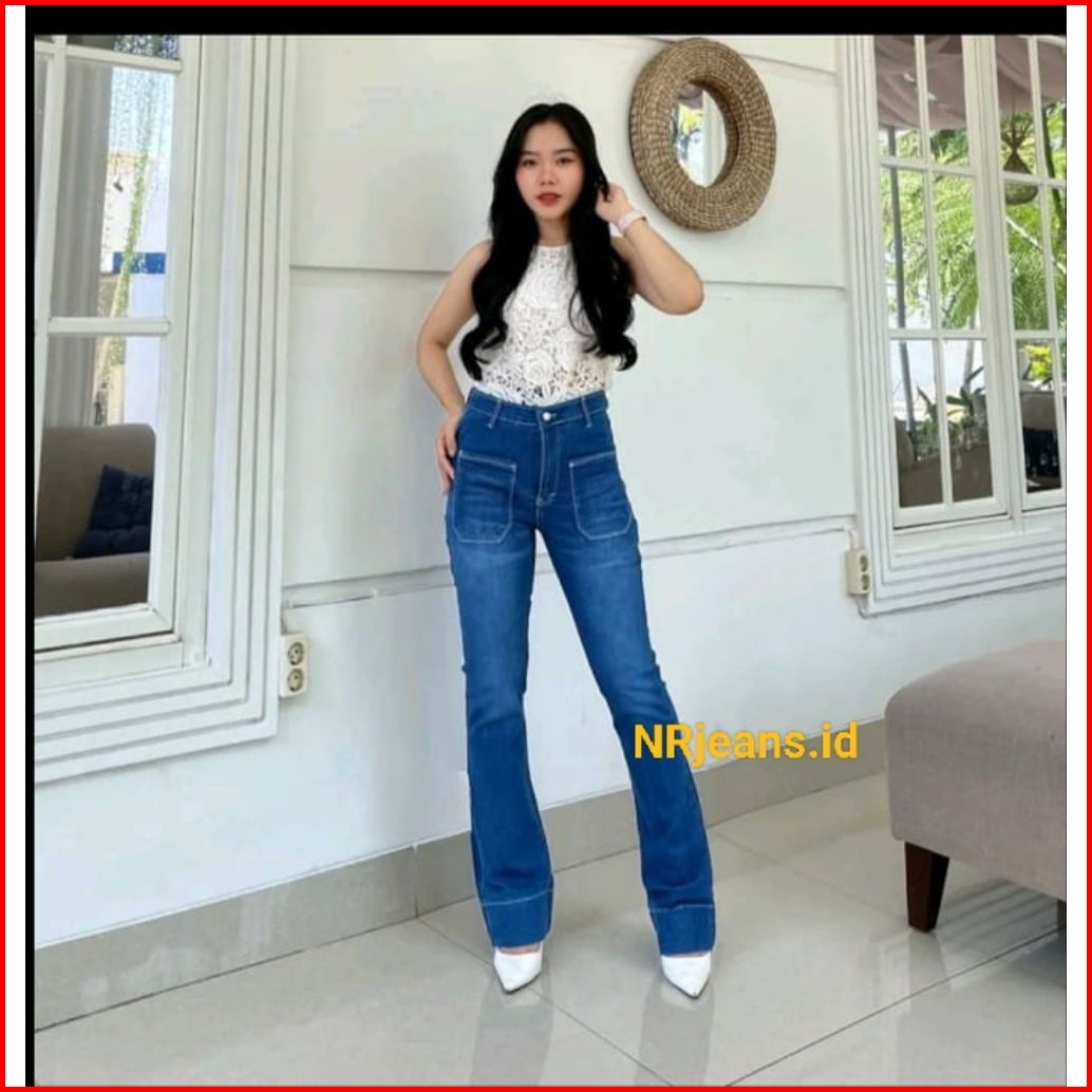 Celana Jeans Pocket Stretch - Highwaist Cutbray Jeans Retro Lipat Lebar - Flare Jeans Retro Vintage Panjang Celana Cutbr