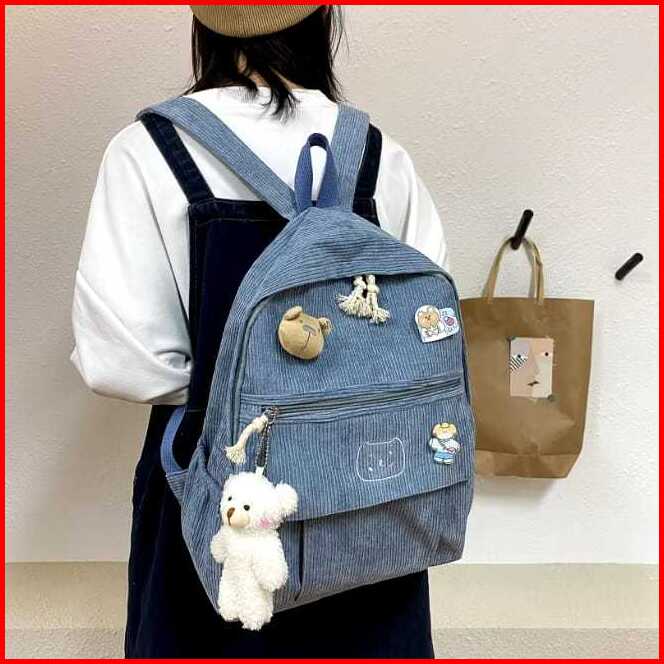 Tas Ransel Sekolah Corduroy Motif Beruang Korean Backpack Wanita Anak Perempuan Tas Cewe Cantik