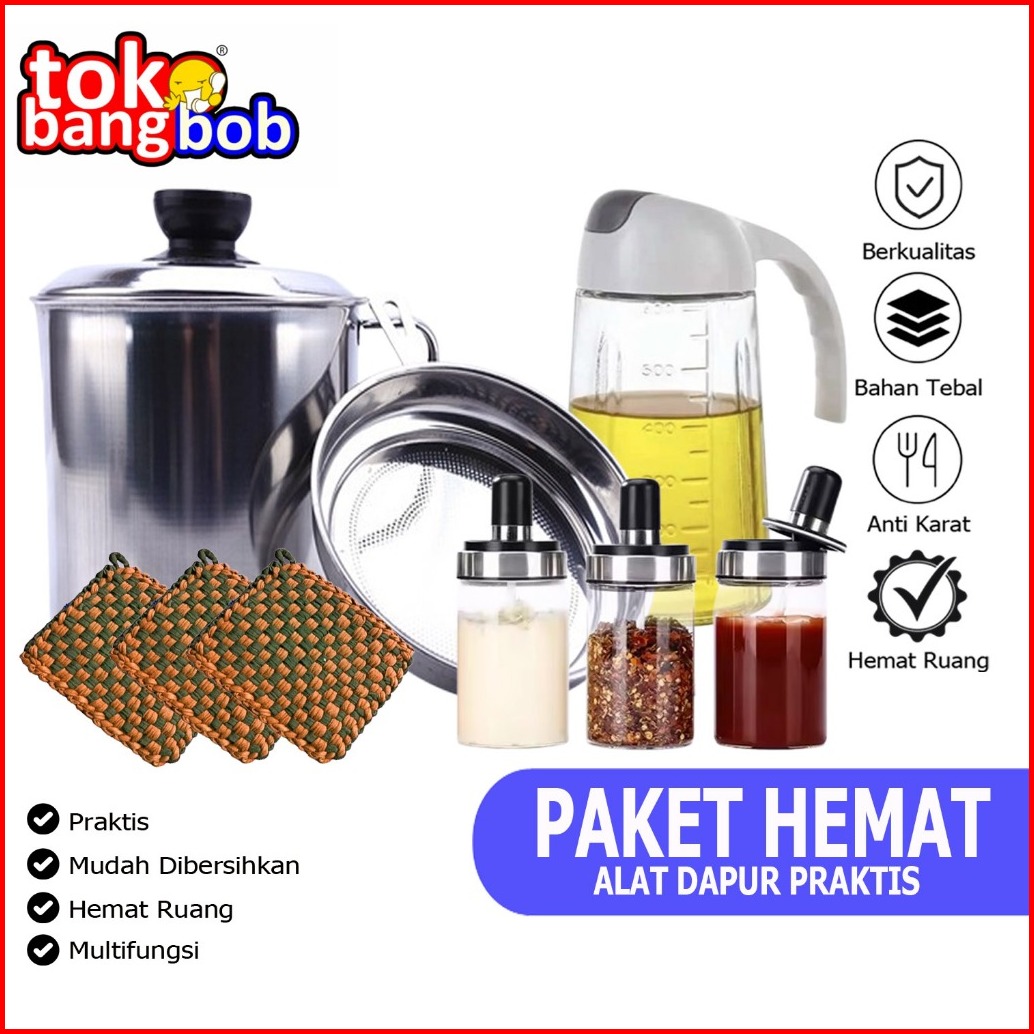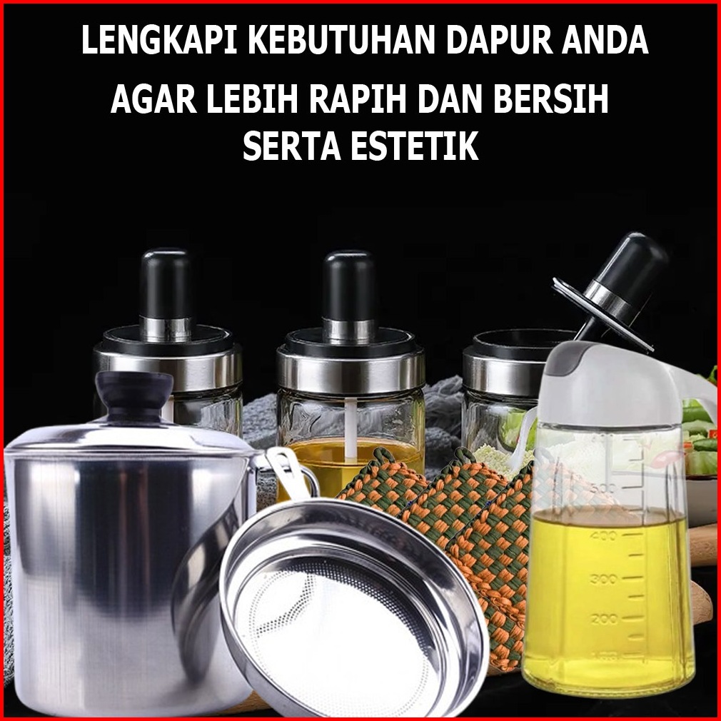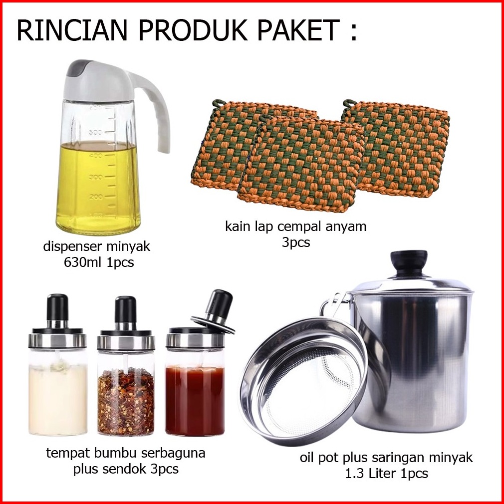 Paket Hemat 8in1 Oil Pot Stainless 1l Dispenser Minyak 630ml Tempat Bumbu Kain Lap Cempal