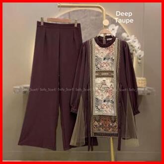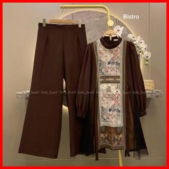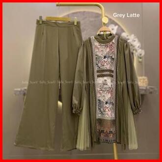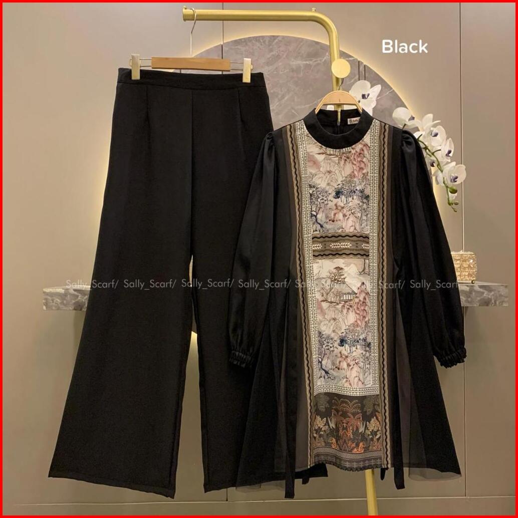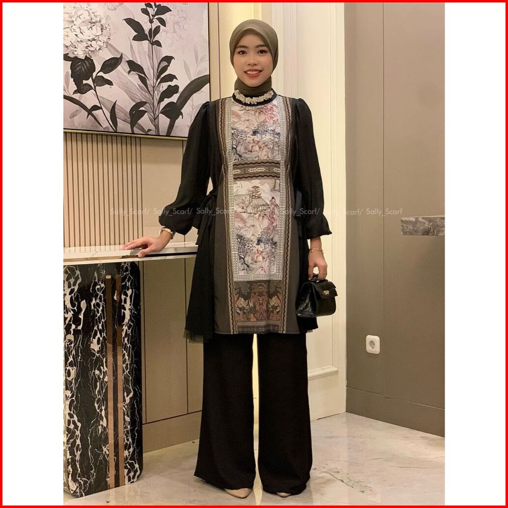 Sally Scarf- Arrisa Tunik Setelan Celana Printing Mix Brukat Lace One Set Basic Daily