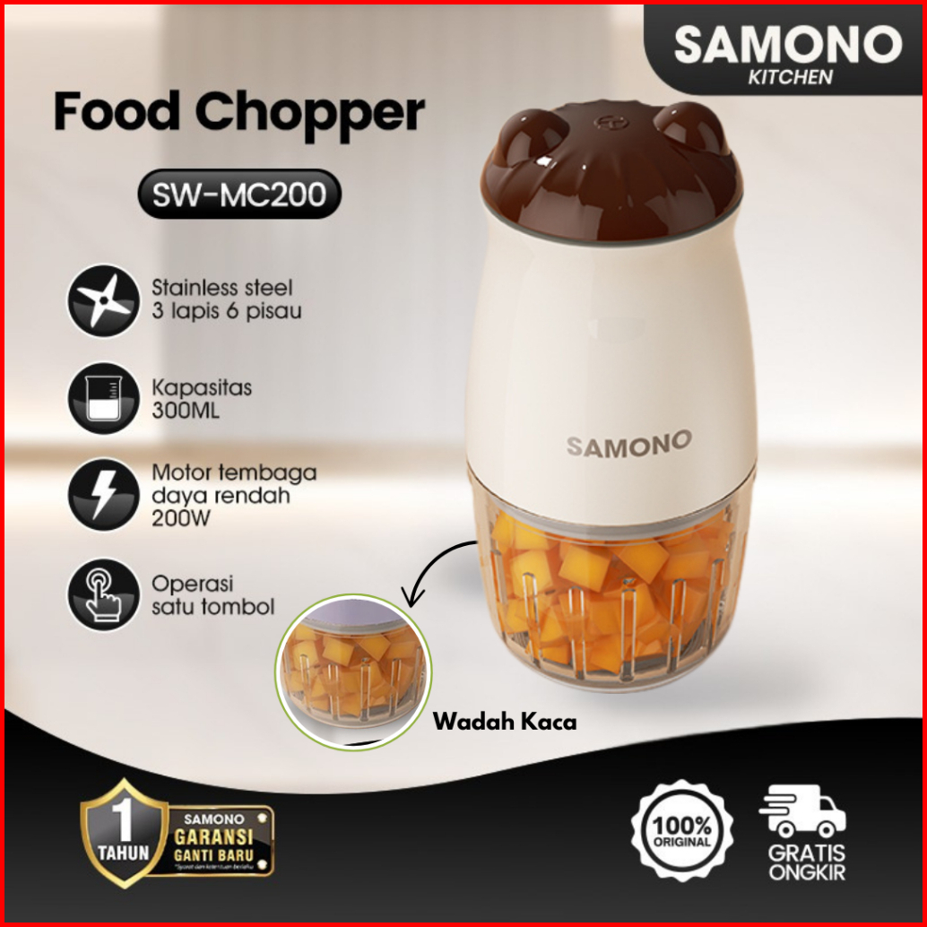 Samono Food Chopper Beige Wadah Kaca 300ml 200watt Penggiling Daging Bumbu Mpasi Sw-mc200 Garansi 1 Tahun