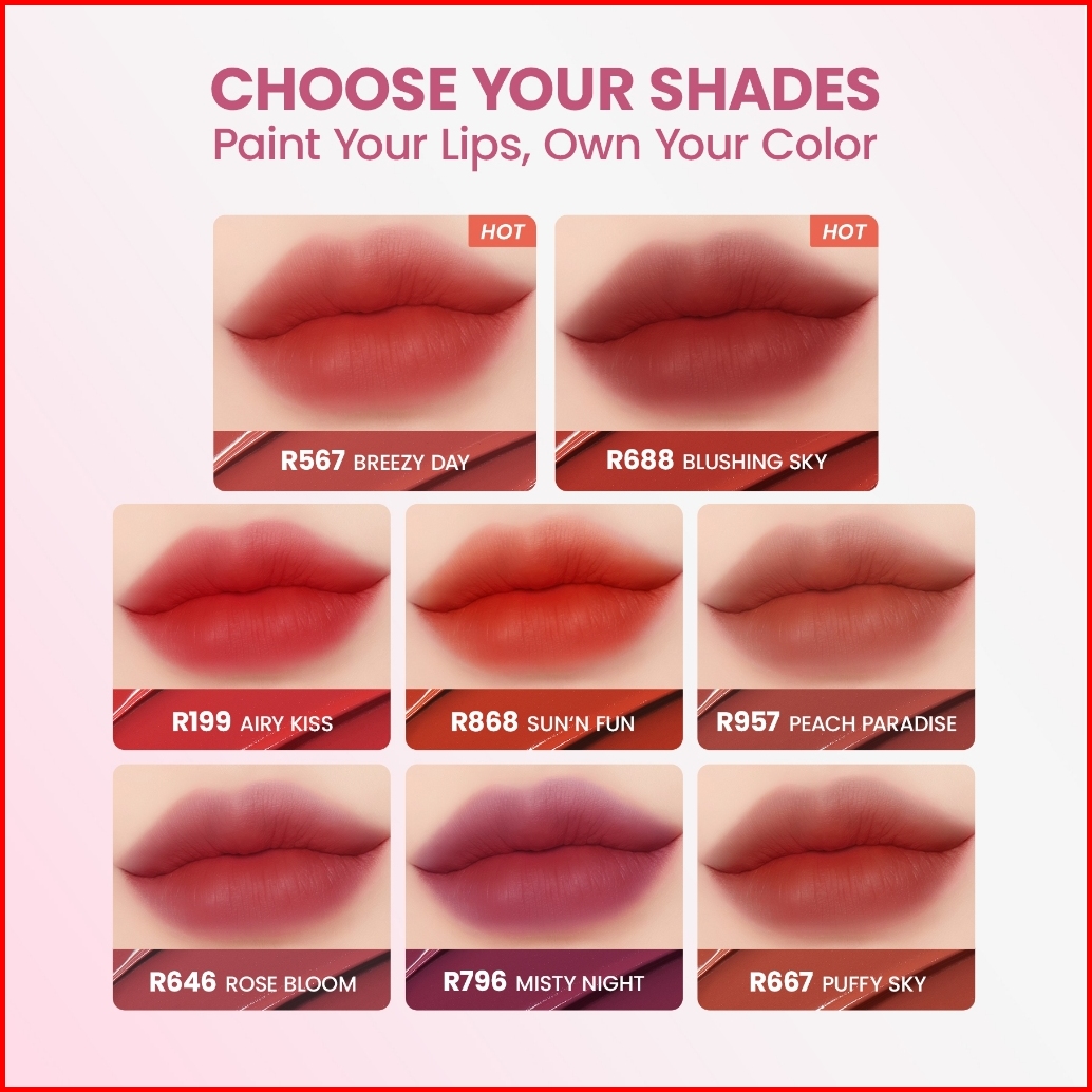 R688 Blushing Sky, P796 Misty Night, R199 Airy Kiss, R646 Rose Bloom, R667 Puffy Sky, R868 Sun'n Fun, R957 Peach Paradise, R567 Breezy Day, A10 Cocoa Haze, A11 Dusty Bloom