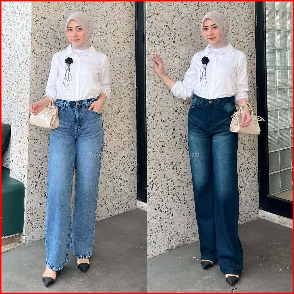Trivela - Highwaist Jeans Retro 114 - Celana Jeans Loose Premium - Celana Kulot Loose Whisker Wanita - Gombrong - Plainb