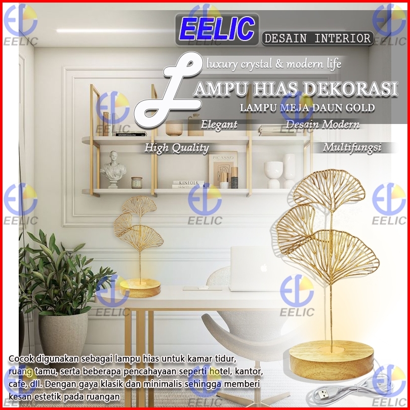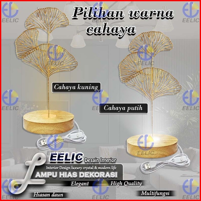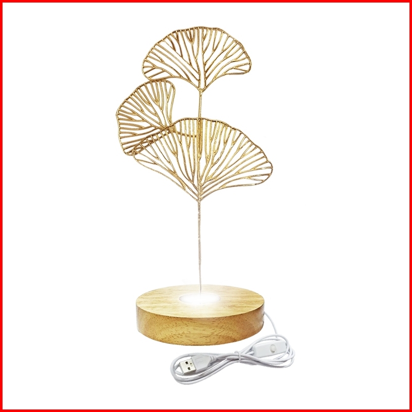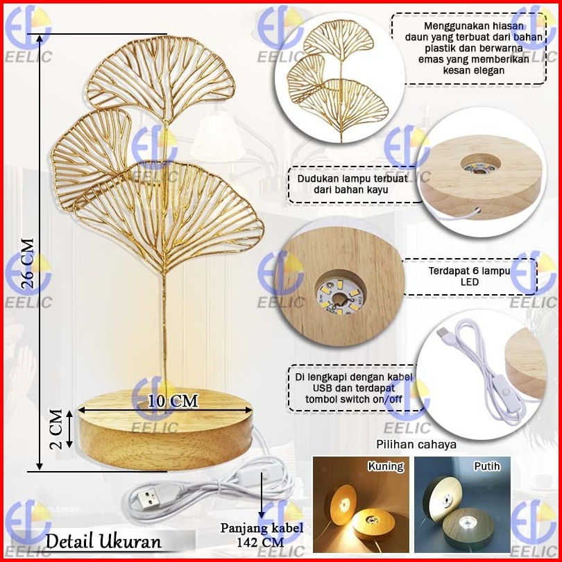 Eelic Elc-m027 Lampu Meja Hias Dekorasi Led Daun Dengan Dudukan Kayu Dan Dilengkapi Dengan Kabel Usb