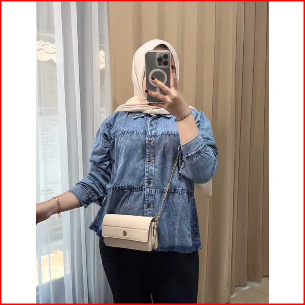 Atasan Wanita Blouse Jeans Ruffle Lengan Panjang Denim Shirt Flare Premium Dengan Desain Elegan Dan Stylish Alea