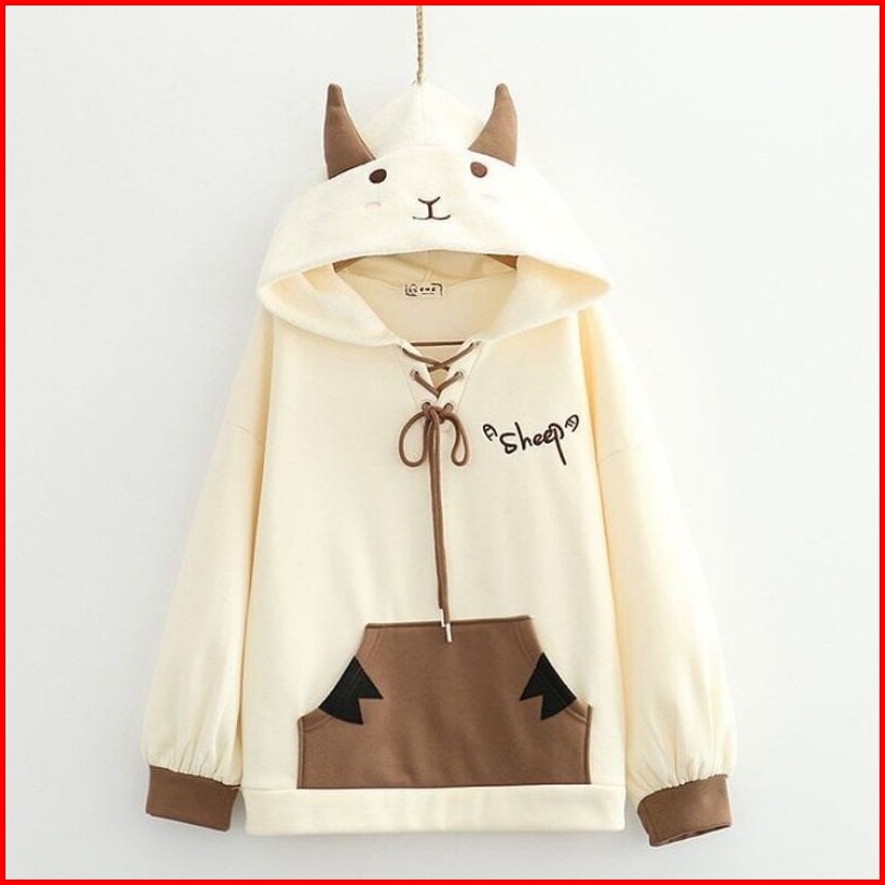 Sheep Sweater Hoodie Wanita Oversize Fleece Tebal - Sweater Korean Style