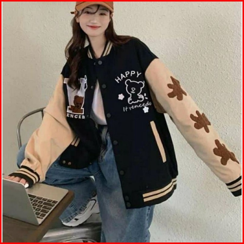 V Happy Bear Jaket Baseball Varsity Lucu Wanita Oversize Jaket Baseball Lucu Wanita Korean Style
