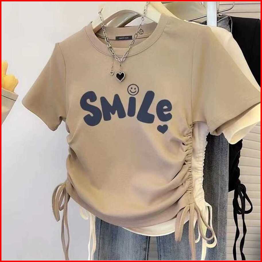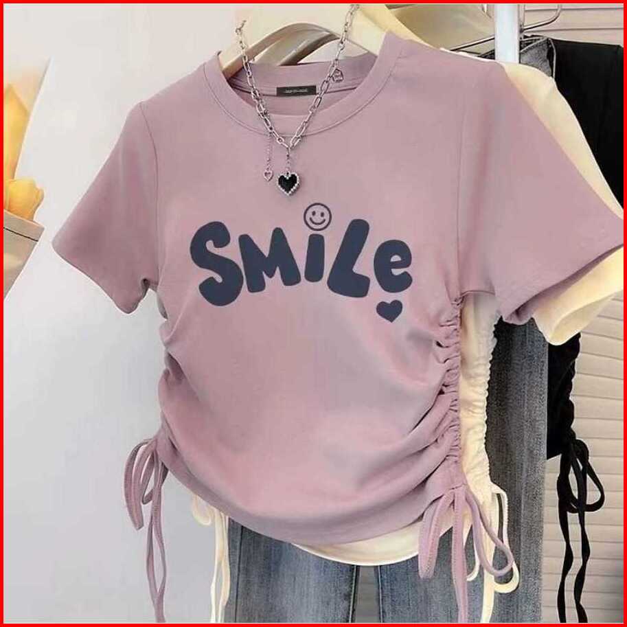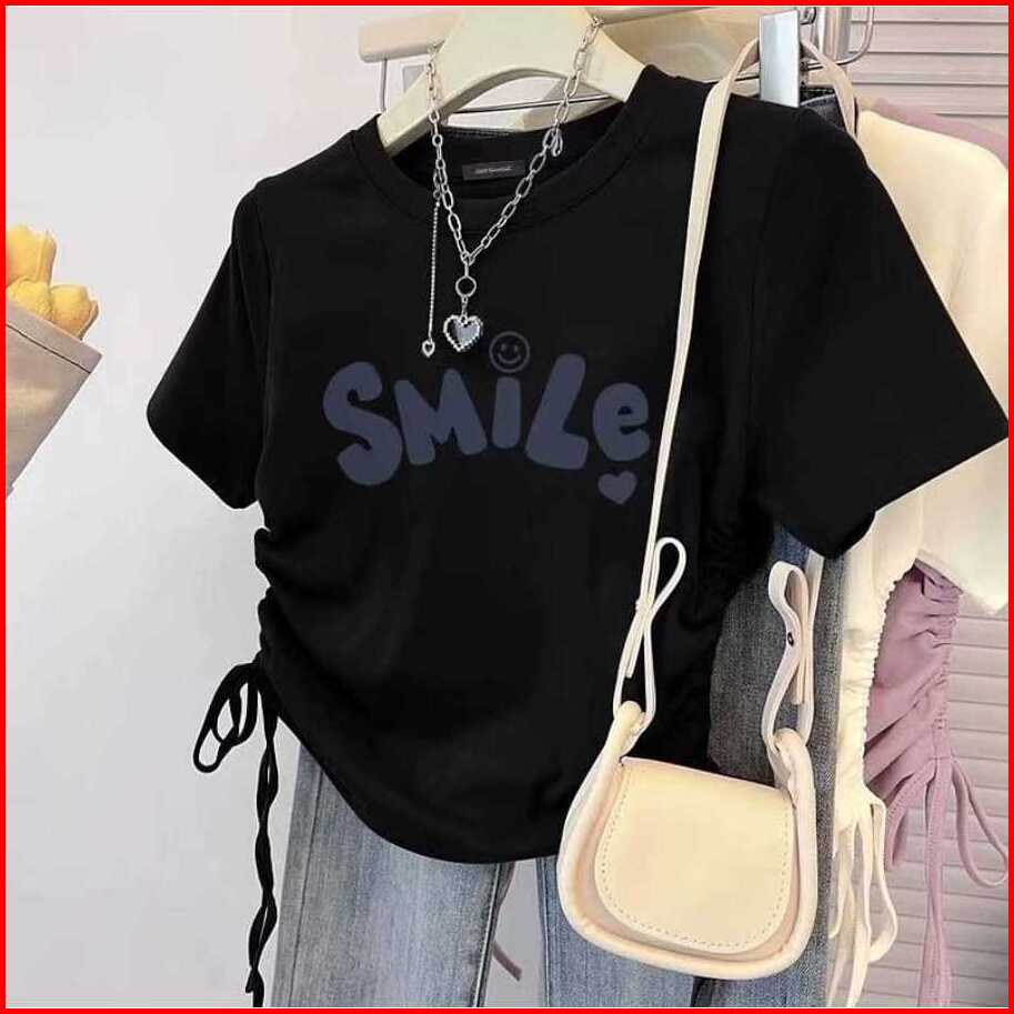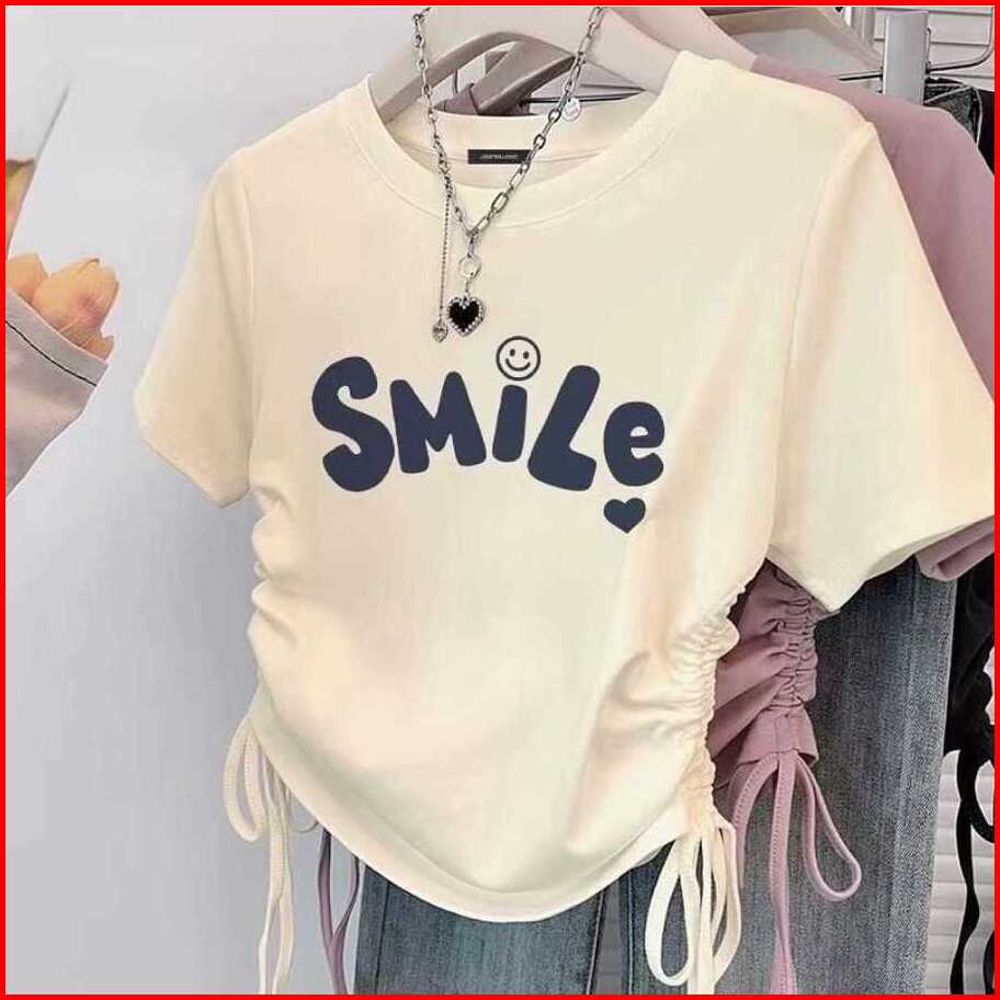 Tshirt Smile Love Baju Serut Wanita Crop Top Baju Kaos Wanita Kekinian