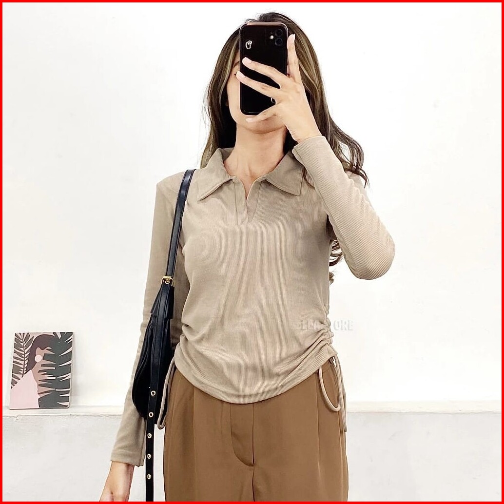 Xena Polo Blouse - Baju Atasan Wanita Kekinian Rajut Lengan Panjang Casual Top Loongsleve