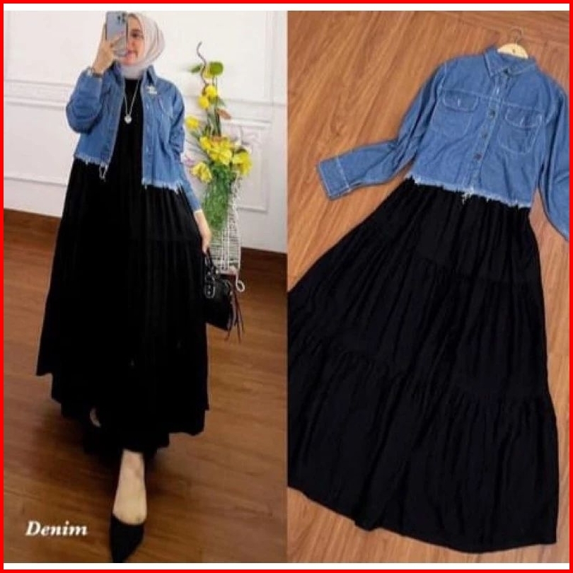 One Set Jaket Jeans Crop Dan Iner Susun Dress Busui Setelan Wanita Kekinian Dan Viral Ukuran Jumbo