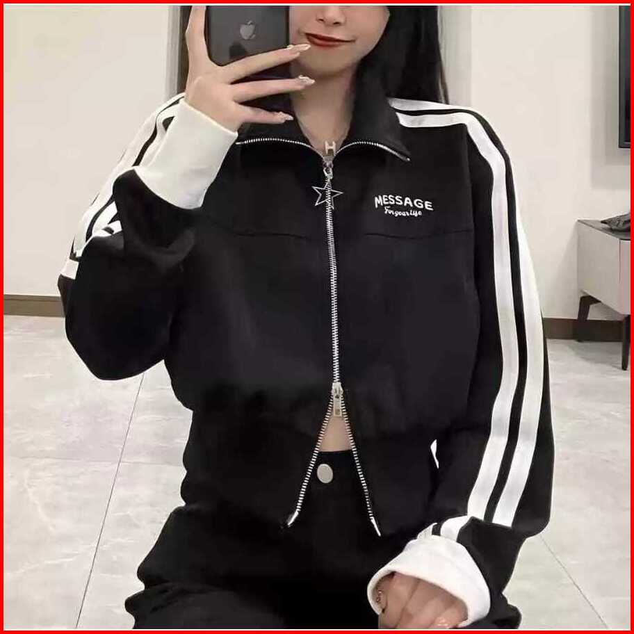 Croope Jaket Wanita Message Jaket Crop Wanita Varsity Double Zipper Crop Top - Jaket Korea