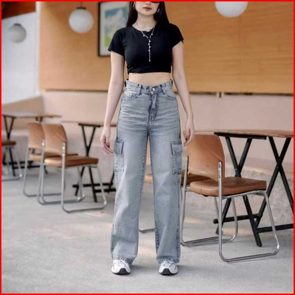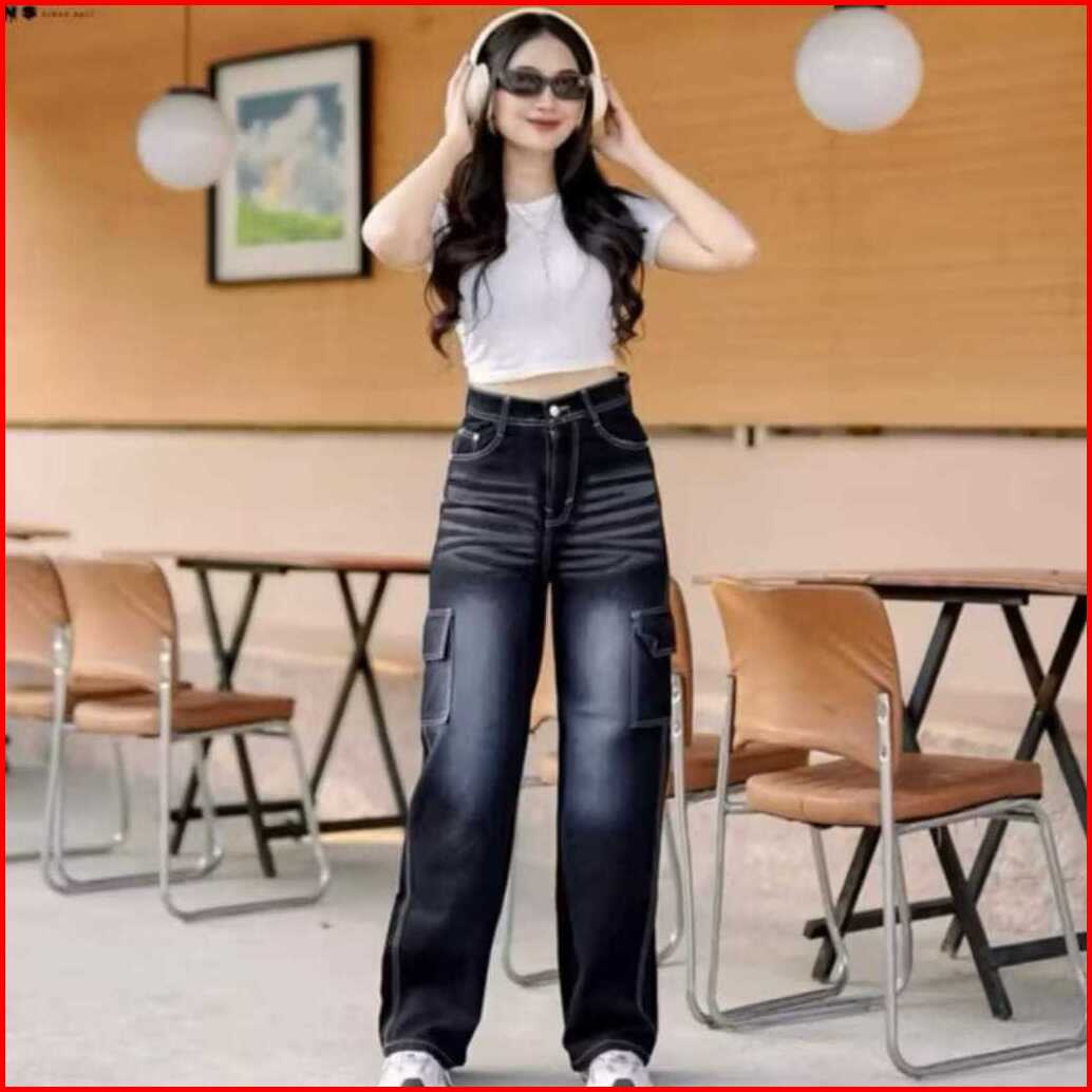 Cuci Gudang Celana Cargo Jeans Retro Highwaist Celana Cargo Jeans Highwaist Wanita Celana Cargo Jeans Wisker Baggy Celan