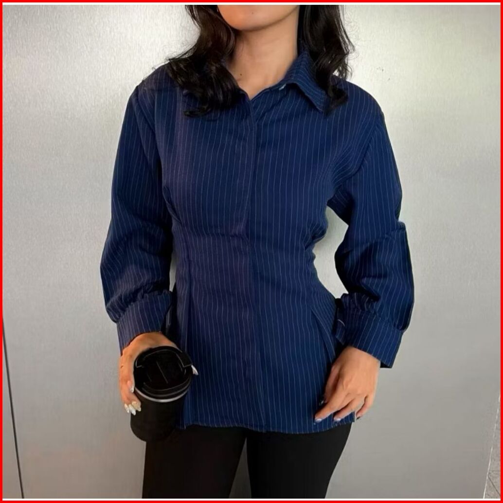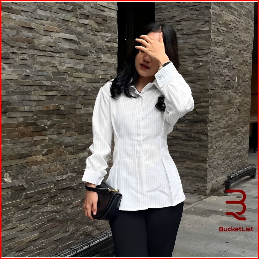 Elton Fitted Shirt Kemeja Salur Terbaru Atasan Wanita Salur Baju Kemeja Wanita Hitam Lengan Panjang Terbaru Kekinian Kem
