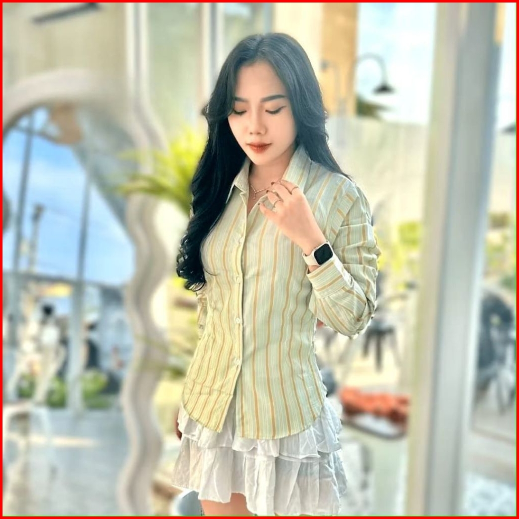 Girl Boss Fitted Shirt Kemeja Kerja Wanita Fit Boddy Garis Stripe Karet Lembut Terlaris