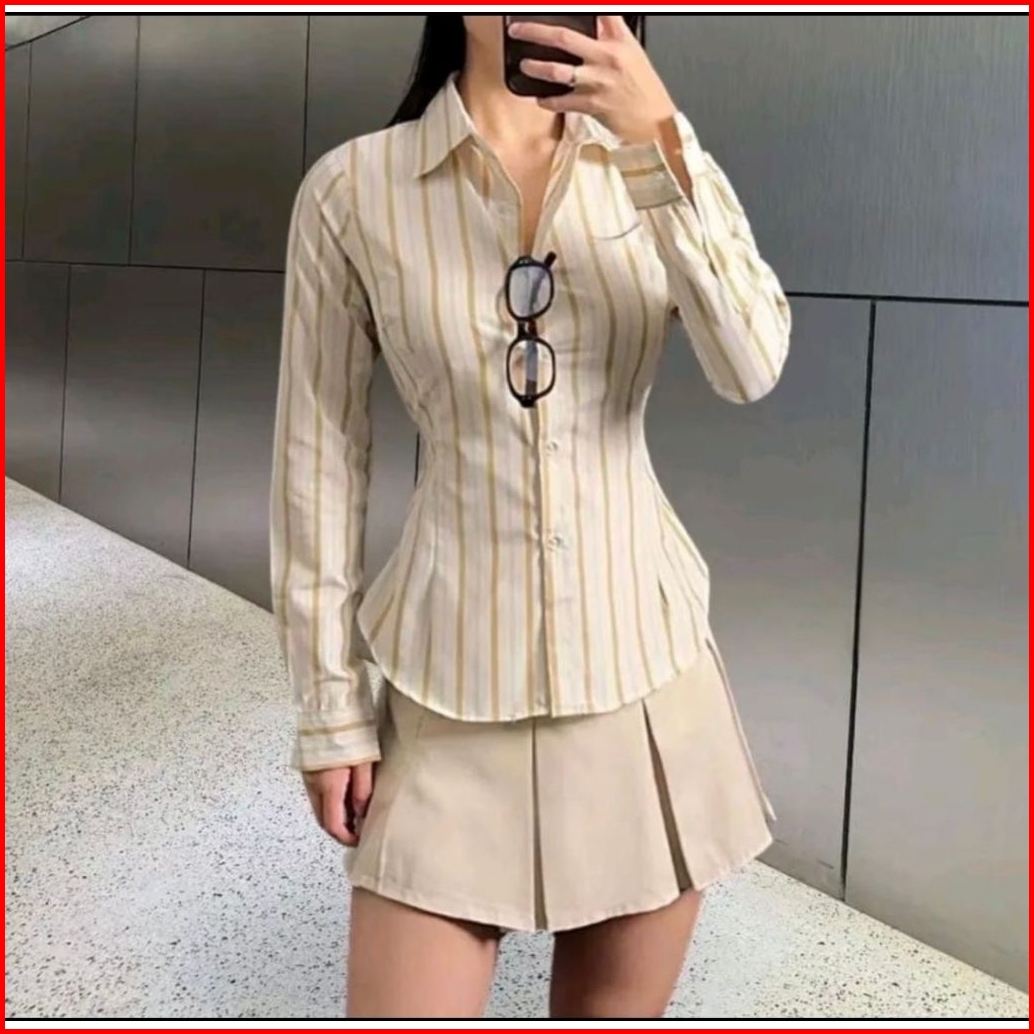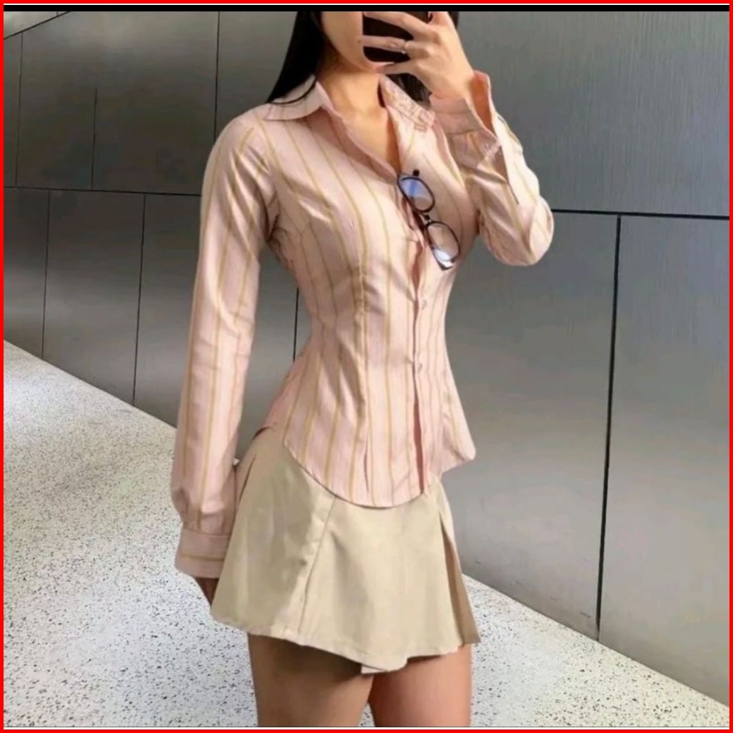 Monney Fitted Shirt Kemeja Slim Motif Stripe Kemeja Kerja Wanita Fit Garis Stripe Karet Lembut Pink Hijau Biru
