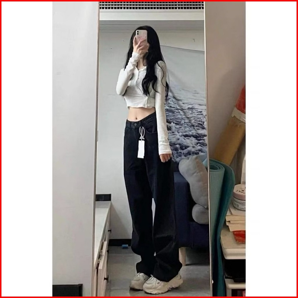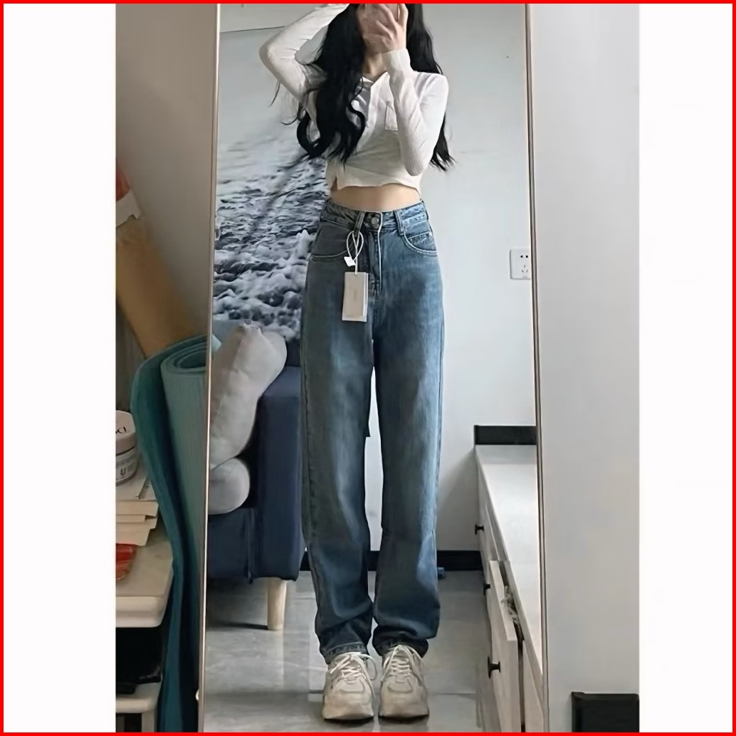 Celana Jeans High Waist Wanita Korean Style Jeans Baggy Pants Serbaguna Kasual Biru Retro