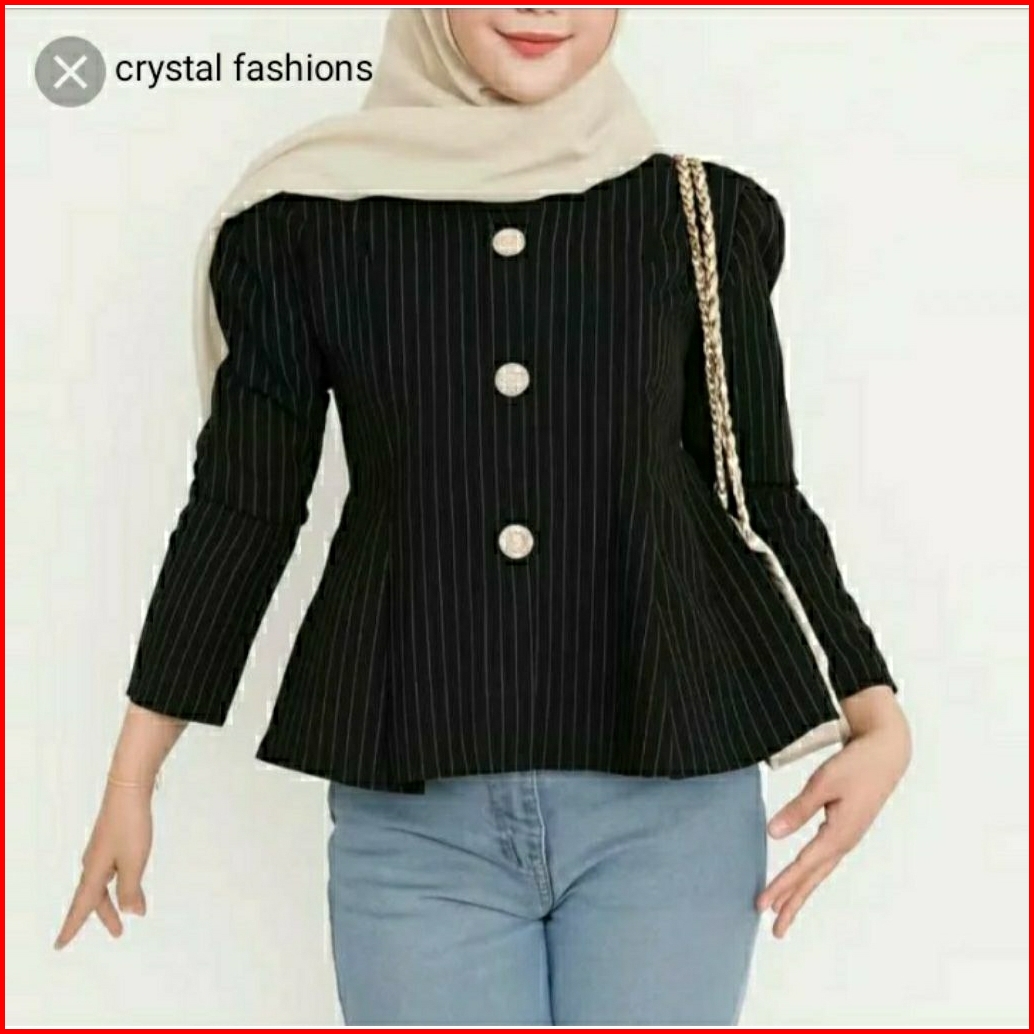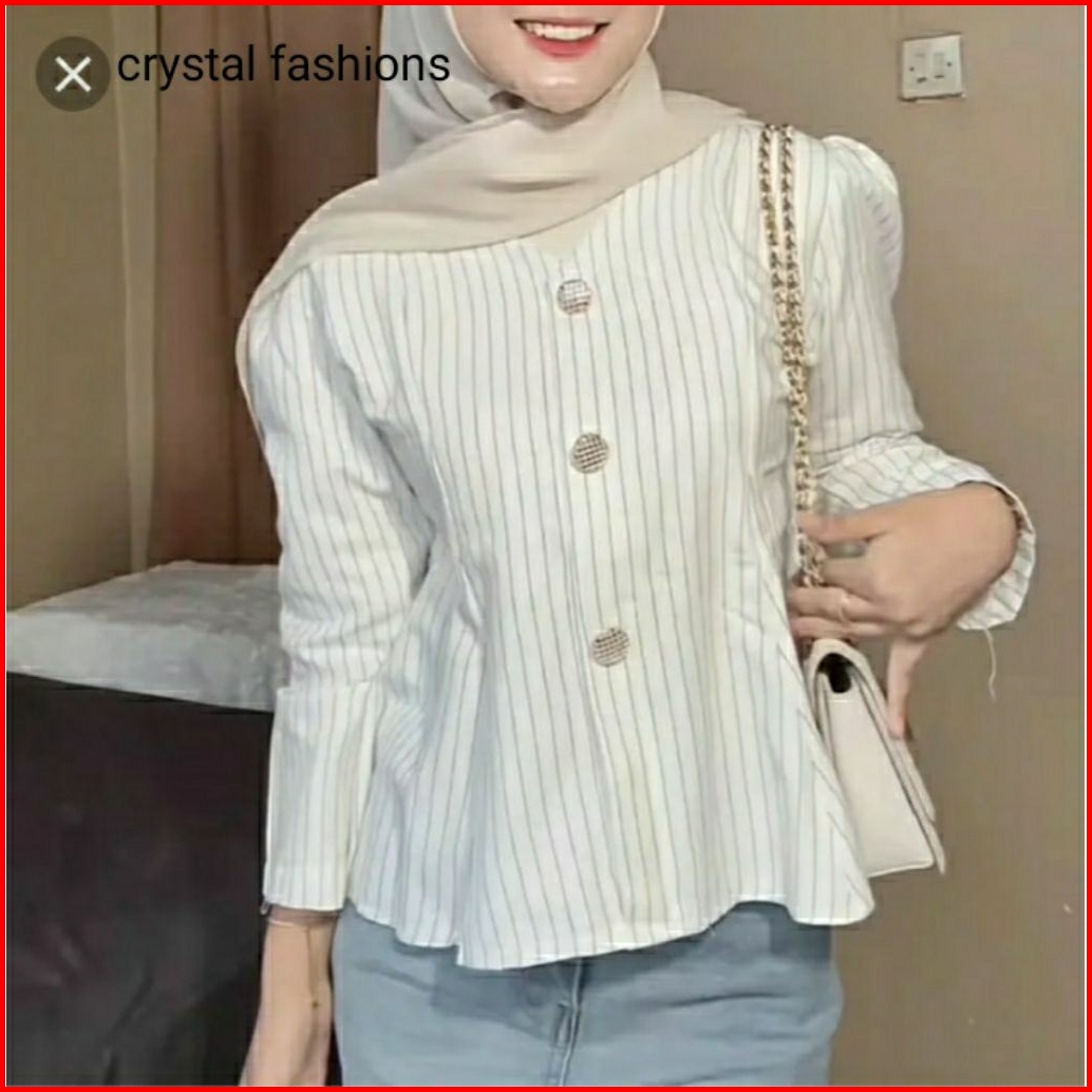 Arika Blouse Stripe Atasan Peplum Wanita Salur Lengan Puff Fit Body Fitted