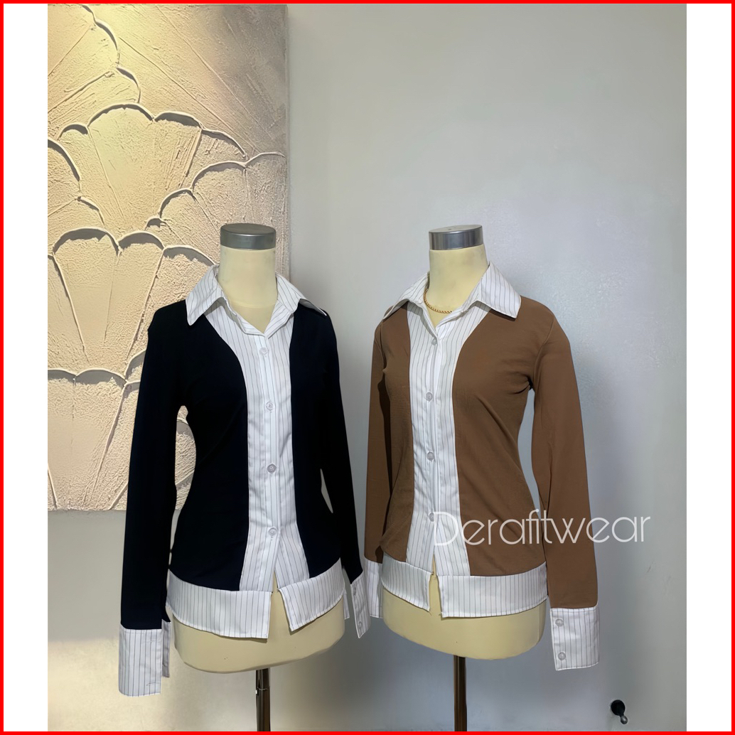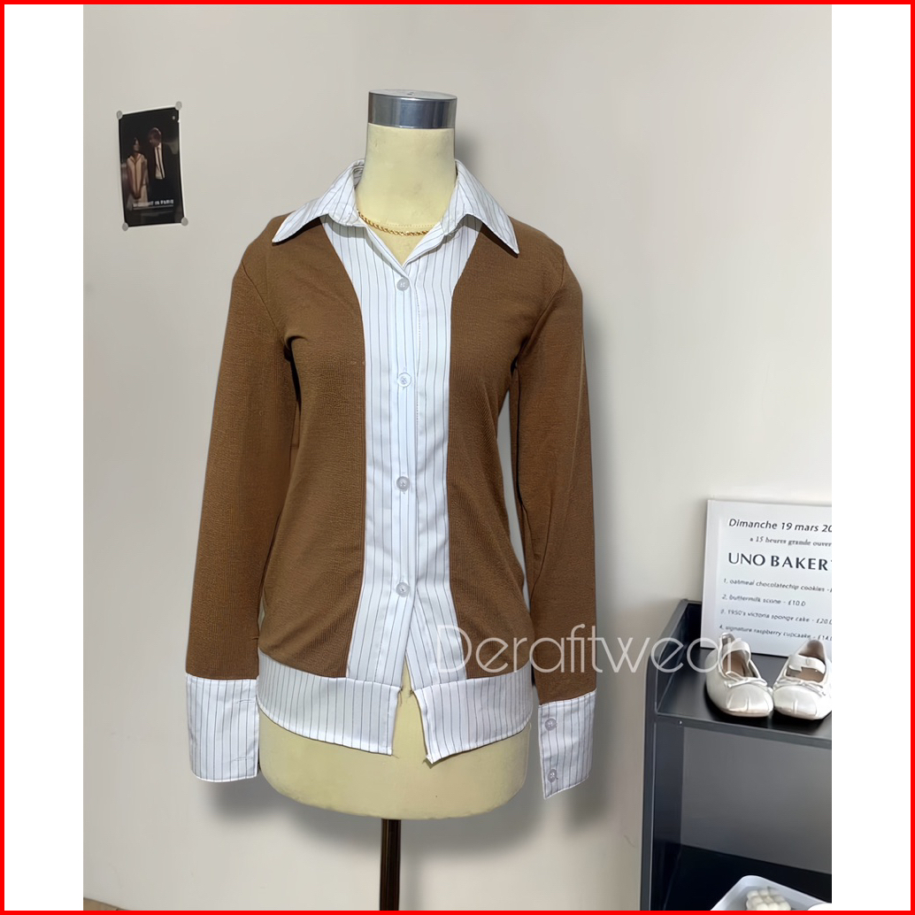 Daizy - Viona Top Kemeja Wanita Kombinasi Knit Striped Fitted Kemeja Kantor Terbaru Trending