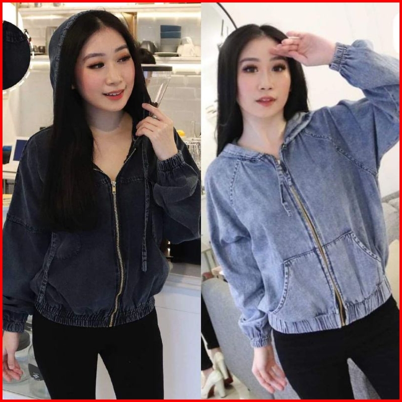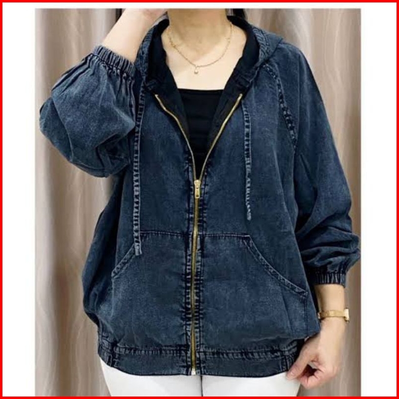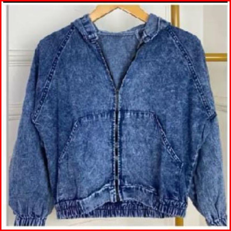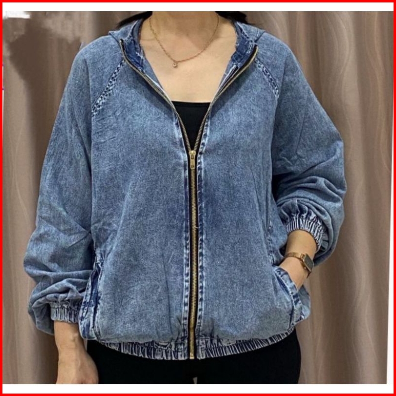 Jaket Jeans Wanita Hoodie Zipper Ld 114cm Resleting Kekinian