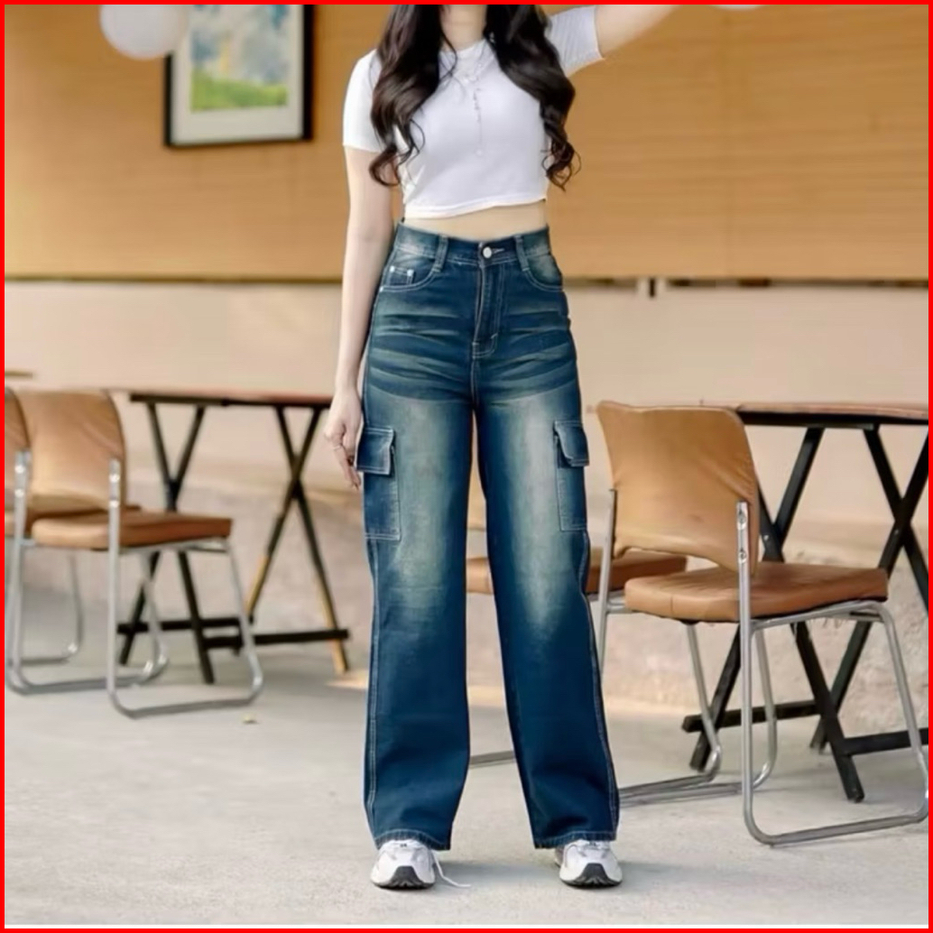Highwaist Baggy Cargo Loose Jeans Retro Whisker - Celana Cargo Jeans Wanita