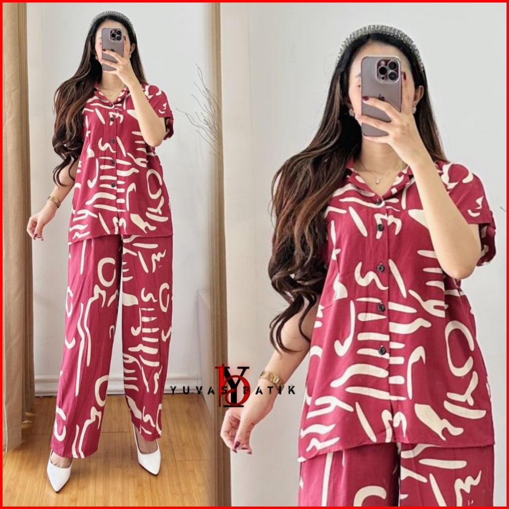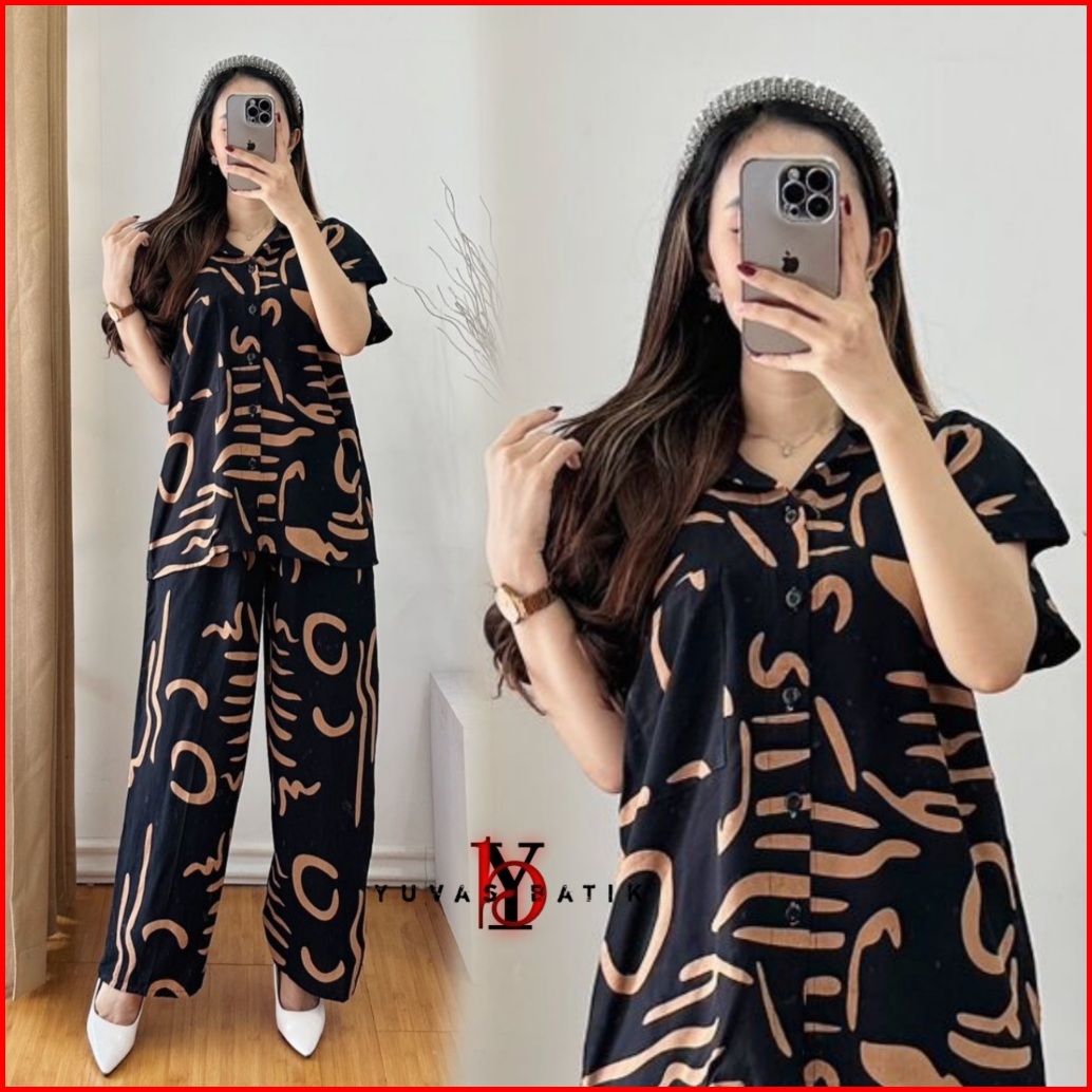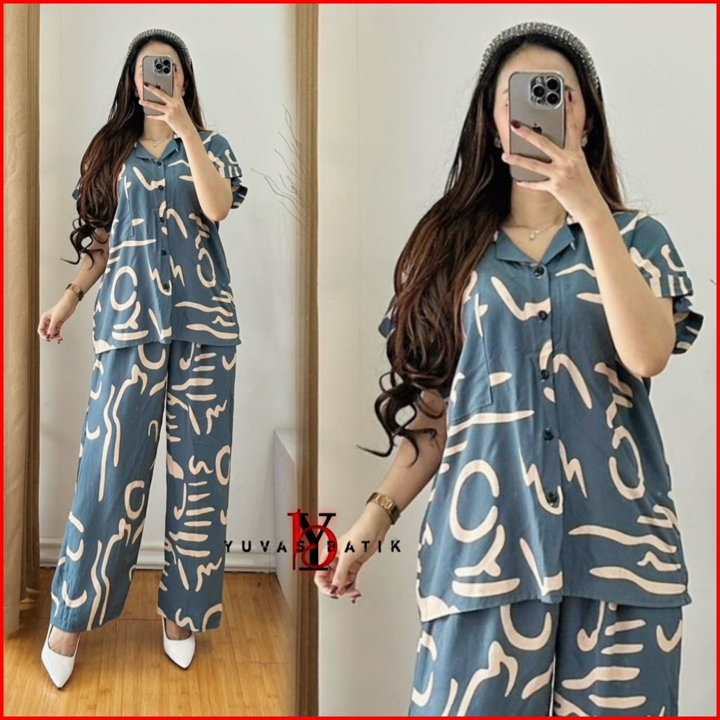 One Set Lisa Rayon Kancing Depan Busui Piyama Hits Motif Terbaru Setelan Celana Panjang Ld 120cm