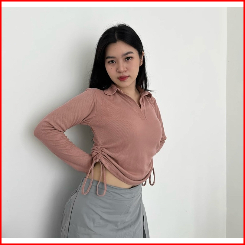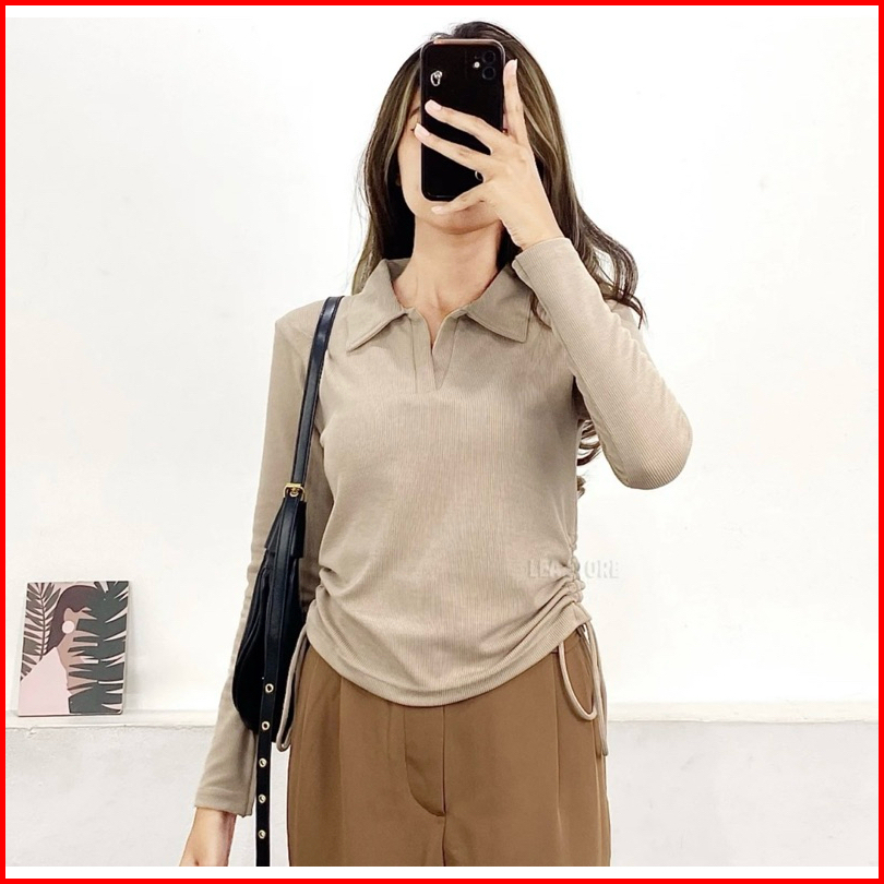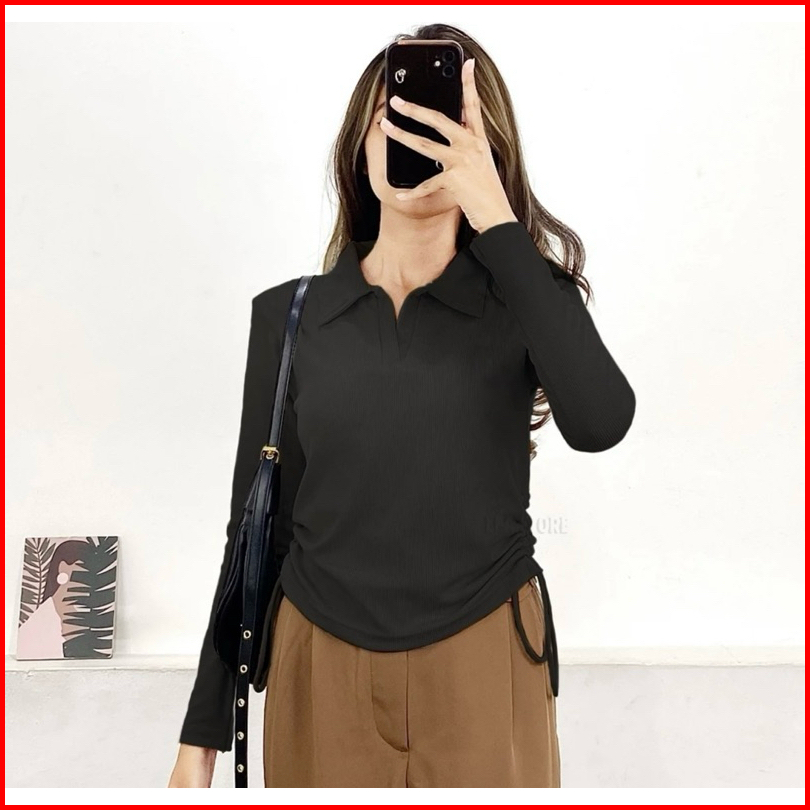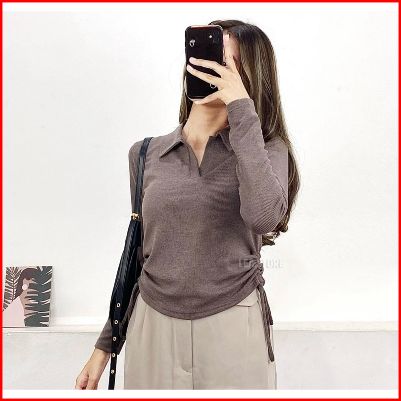 Polo Top Kerah Tali Serut Samping Kaos Berkerah Vneck Lengan Panjang Wanita Style Korea