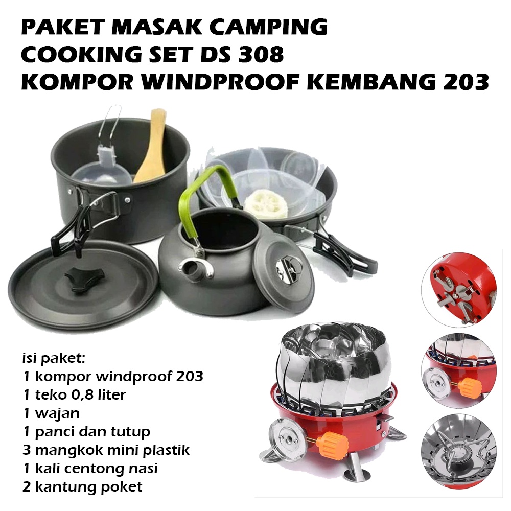 Paket Masak Camping Cooking Set 308 plus Kompor Windproof K203 - Alat Masak Camping