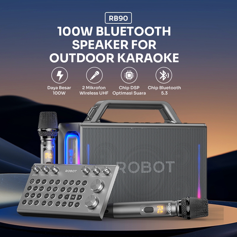 ROBOT Karaoke Speaker RB90 100W Powerfull Bass DSP Bluetooth 5.3 Dual Wireless Mic RGB Lamp Outdoor Original - Garansi 1