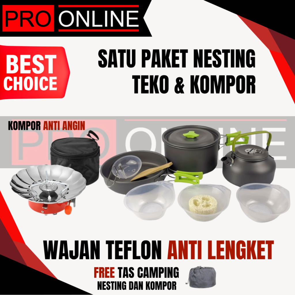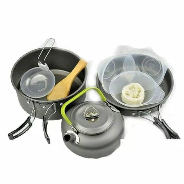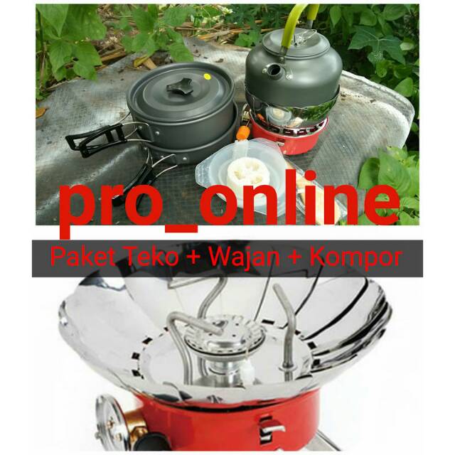 Paket Wajan Teko & Kompor Windproof Kemping Gunung Cooking Set DS308 & Stove K203 Camping Outdoor
