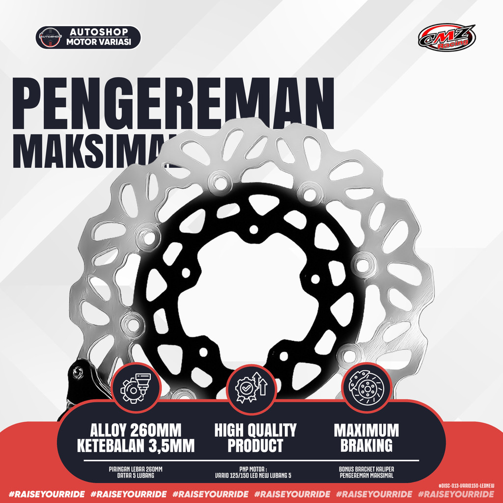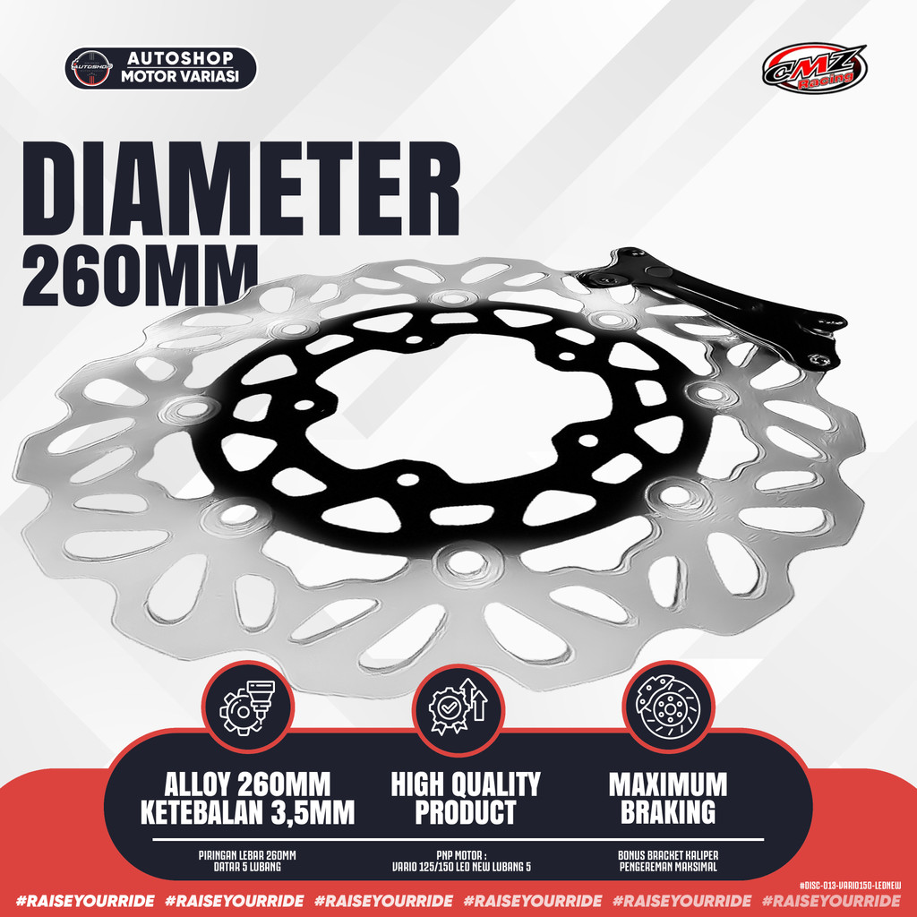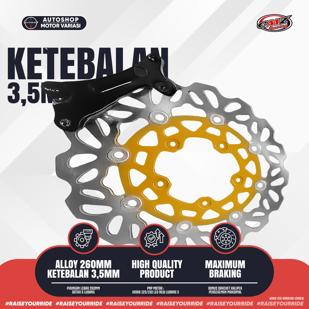 Piringan Cakram Depan 260MM VARIO 125/150 LED NEW - Discbrake Rotor Alloy Lubang 5 Model PSM + Bracket Kaliper kuning mengkilap/Hita