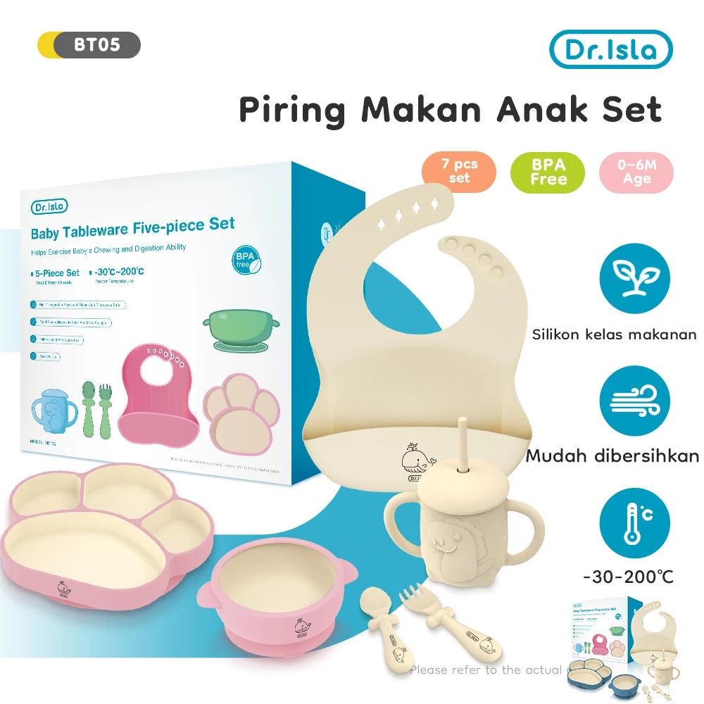 Dr.isla Piring Makan Anak Set 7Pcs Mangkuk Sendok Makan Bayi Celemek Makan Bayi Botol Minum Bayi Set Kotak Hadiah BT05
