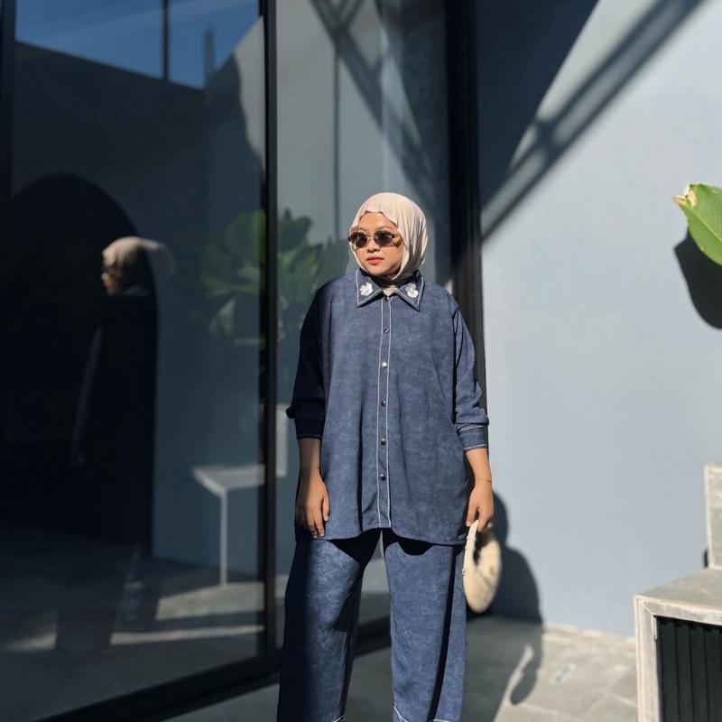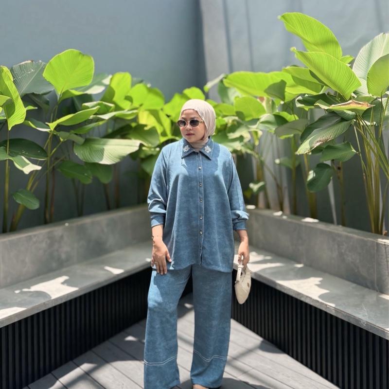 Denacollection Salira Setelan Kemeja Kulot Knit Printing Motif Jeans Oversize Busui Friendly Baju Wanita Nyaman Lembut