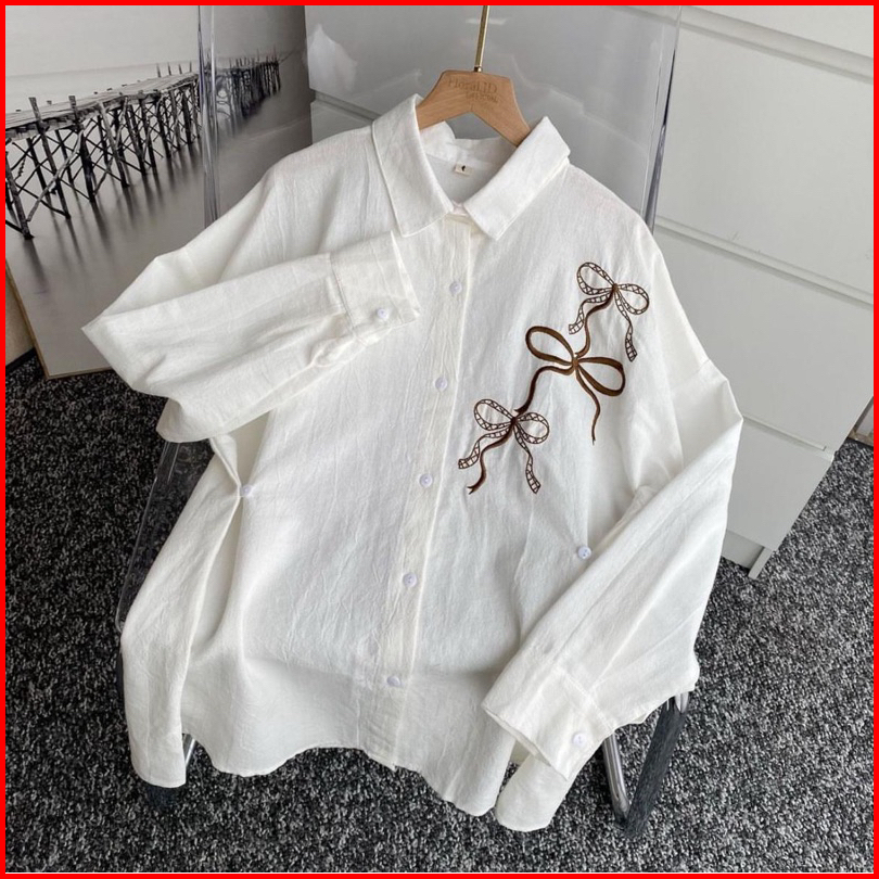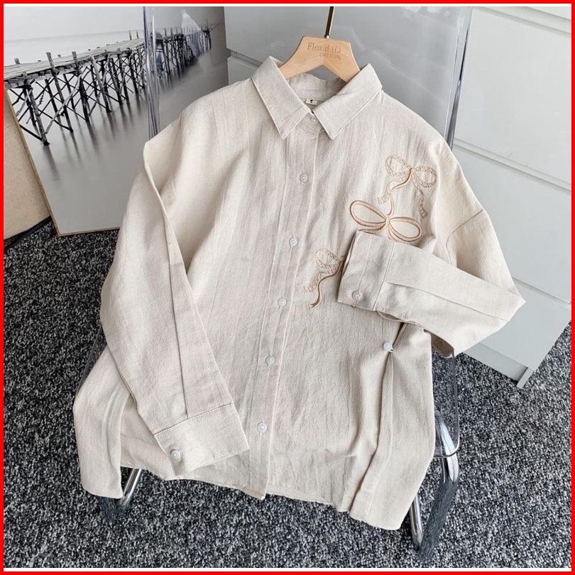 Lora Ribbon Shirt Kemeja Linen Bordir Pita Kemeja Linen Wanita Oversize