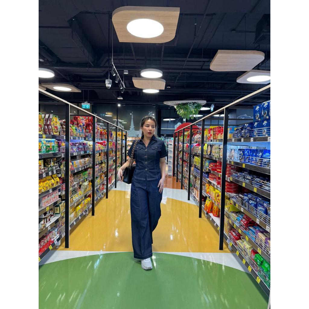 Domscorner - JaeA set denim - kulot hiwhwaist - bustier style top - collar buttoned blouse - baju jeans premium kekinian wanita
