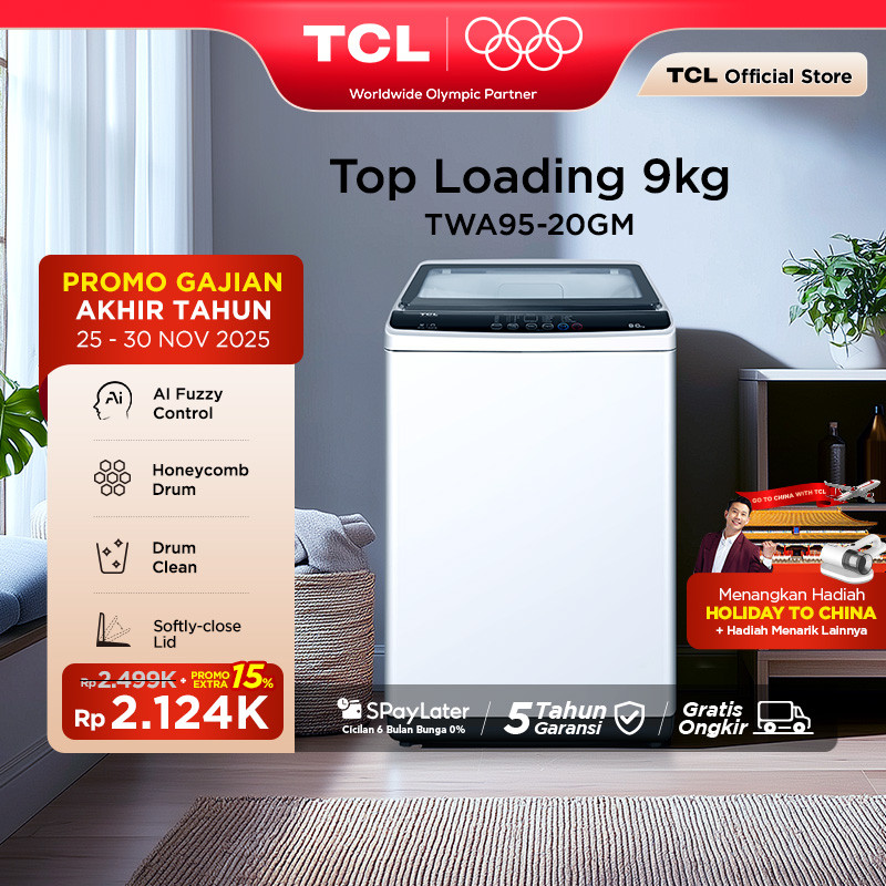 [Star] TCL Mesin Cuci 1 Tabung - Top Loading 9 KG - Honeycomb Crystal Drum - Auto Cleaning - Eight Wash Program - Dual Detergent Case (Model: TWA95-20GM)