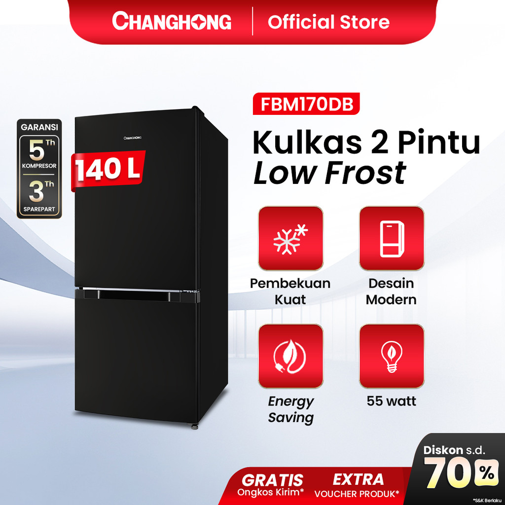 [Star] Changhong Kulkas 2 Pintu (Bottom Mounted Refrigerator) Lemari Es Kapasitas 140 Liter FBM170DB Black