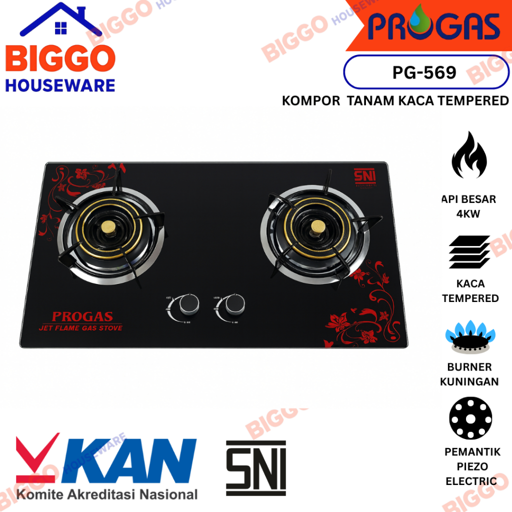 [Star] PROGAS Kompor Gas Tanam 2 Tungku PG-569 Kaca Hitam, Bunga Merah SNI Garansi 1 Tahun Api Biru Besar