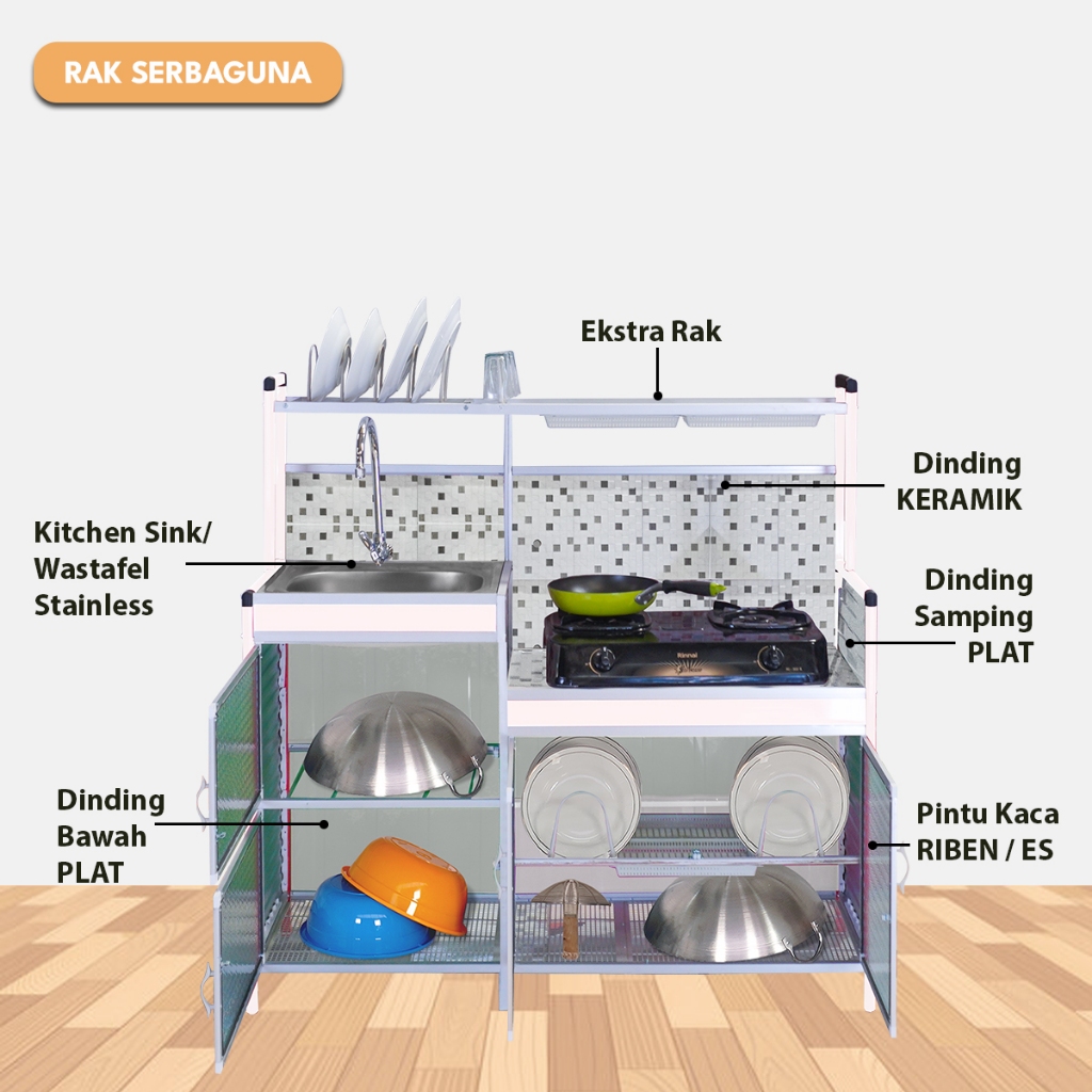 Rak Serbaguna Kompor & Wastafel dengan Kitchen Sink dan Rak Piring – Full Keramik & Kaca