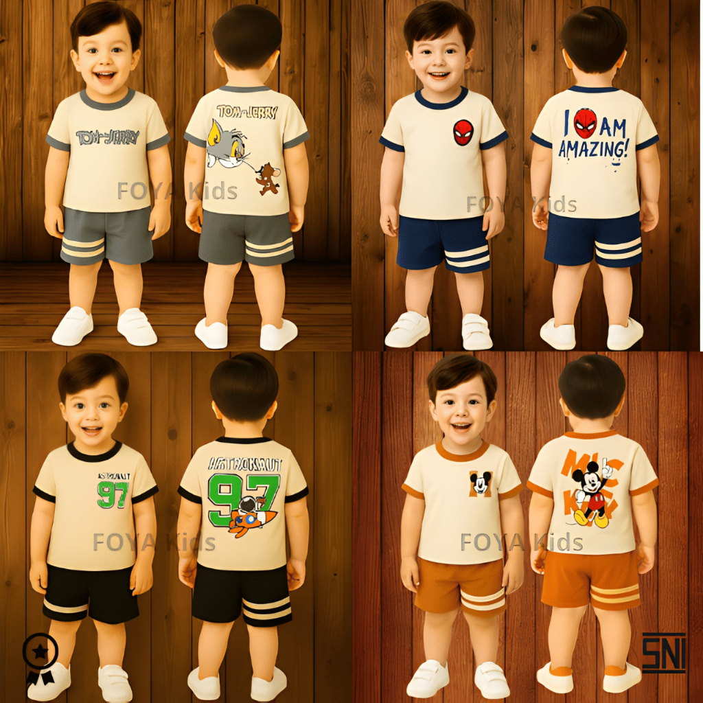 FOYA Kids - Setelan Premium Anak Karakter Usia 0 - 6 Tahun / Setelan Celana Pendek Motif Spiderman/Astronot/Pesawat/Tom
