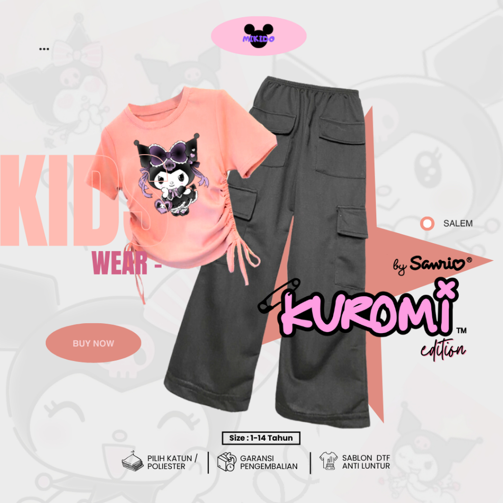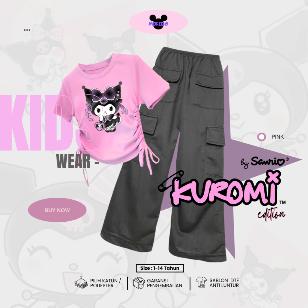 Setelan Kaos Serut Crop Top dan Celana Kargo Anak Perempuan Kekinian Kuromi Cinnamorol Sanrio