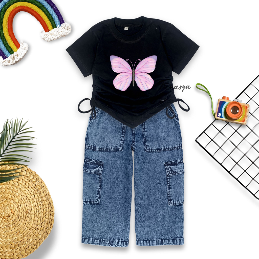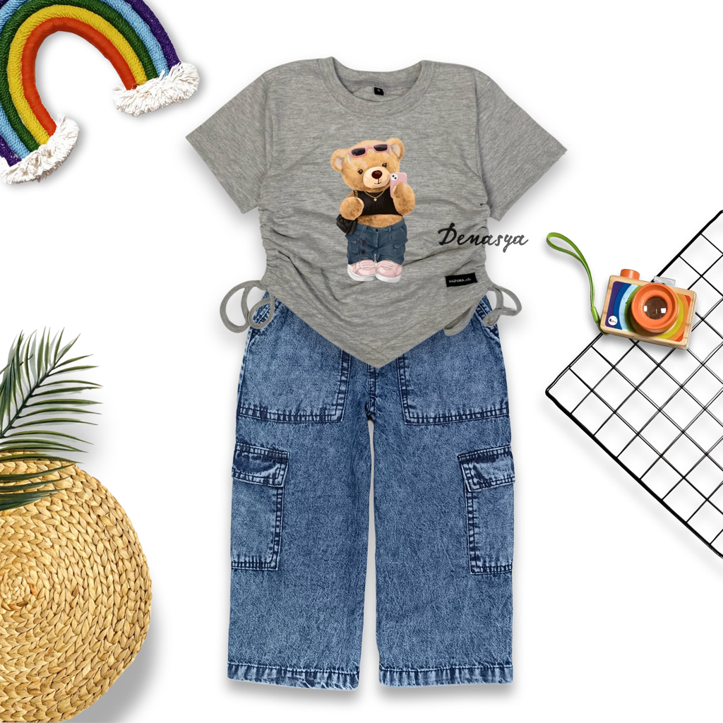 SETELAN ANAK PEREMPUAN KEKINIAN / ONE SET KULOT CARG0 JEANS / KAOS SERUT SABLON USIA 2-12 TAHUN