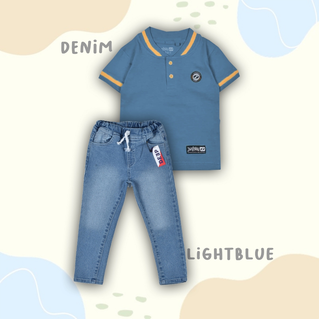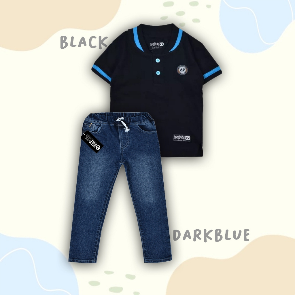 Setelan Anak Laki Laki Kaos Kerah Wangki & Celana Jeans Panjang Usia 1-12 Tahun Bahan Premium