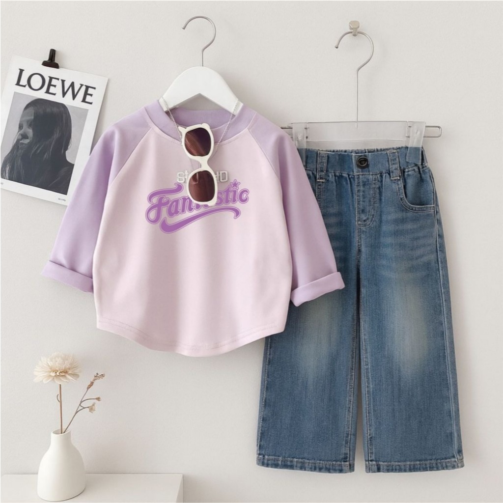 Setelan Baju Anak Kaos Raglan Lengan Panjang + Celana Jeans Denim Lebar Unisex Anak Perempuan Laki Laki Usia 1-12 Tahun