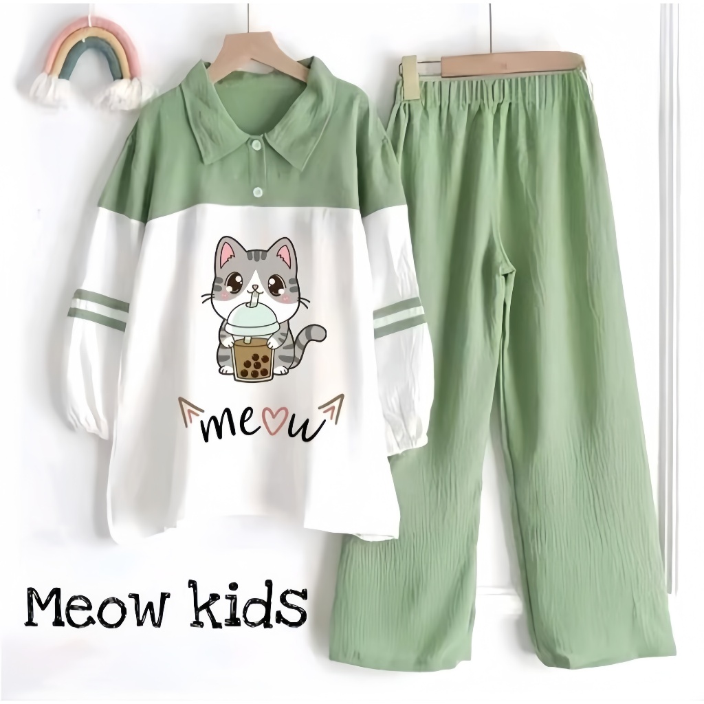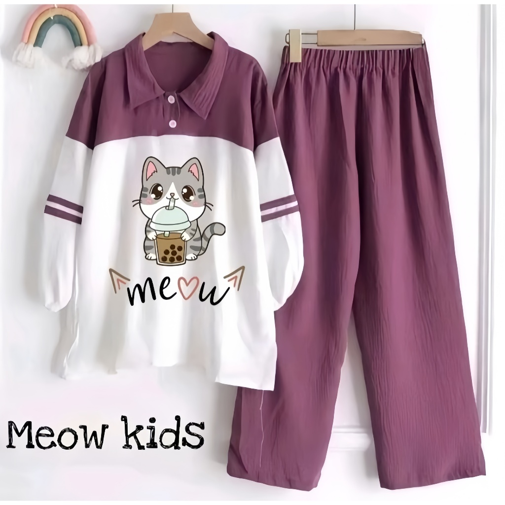 Setelan Anak Perempuan KUCING MEOW Lengan panjang Usia 3 - 12 tahun stelan anak perempuan tanggung