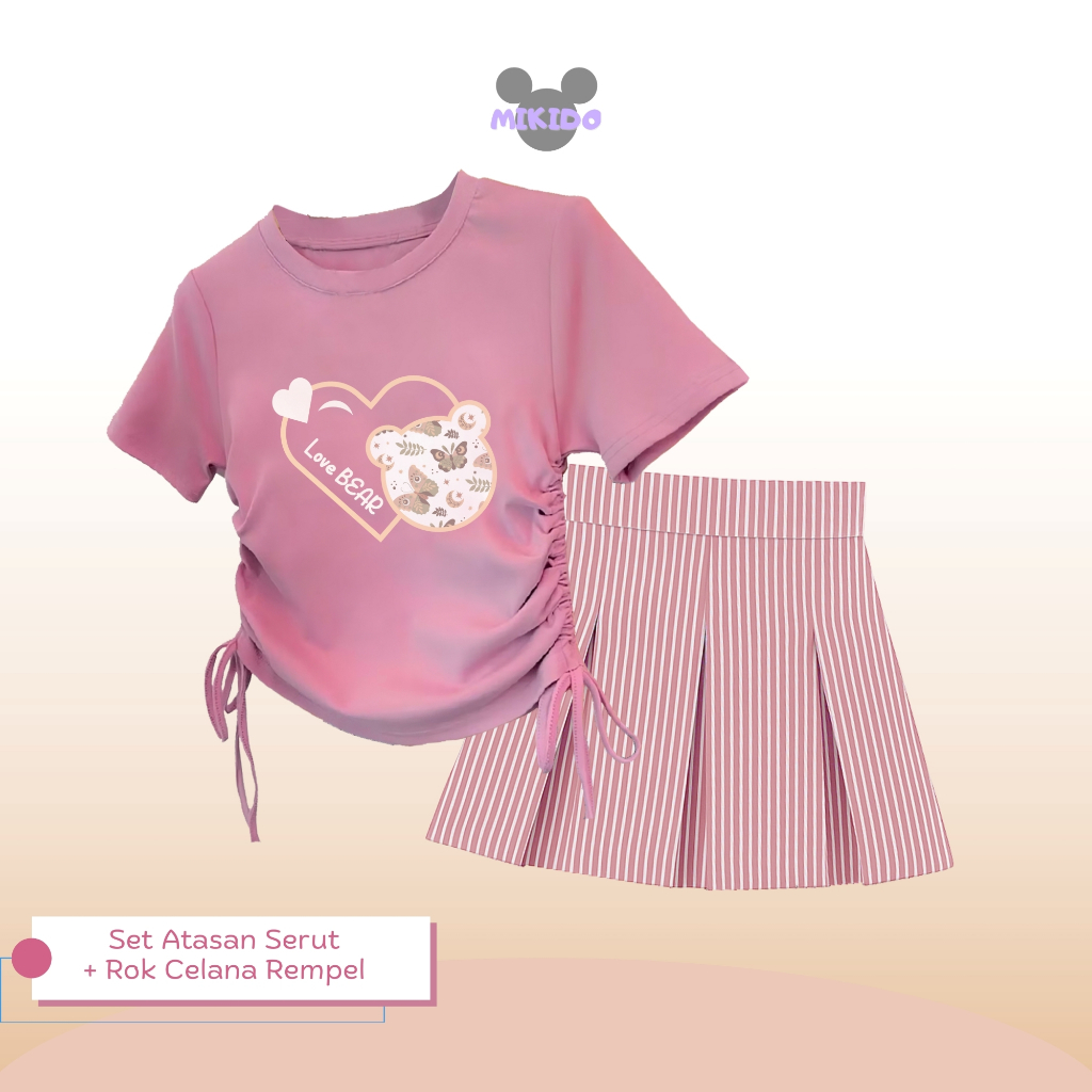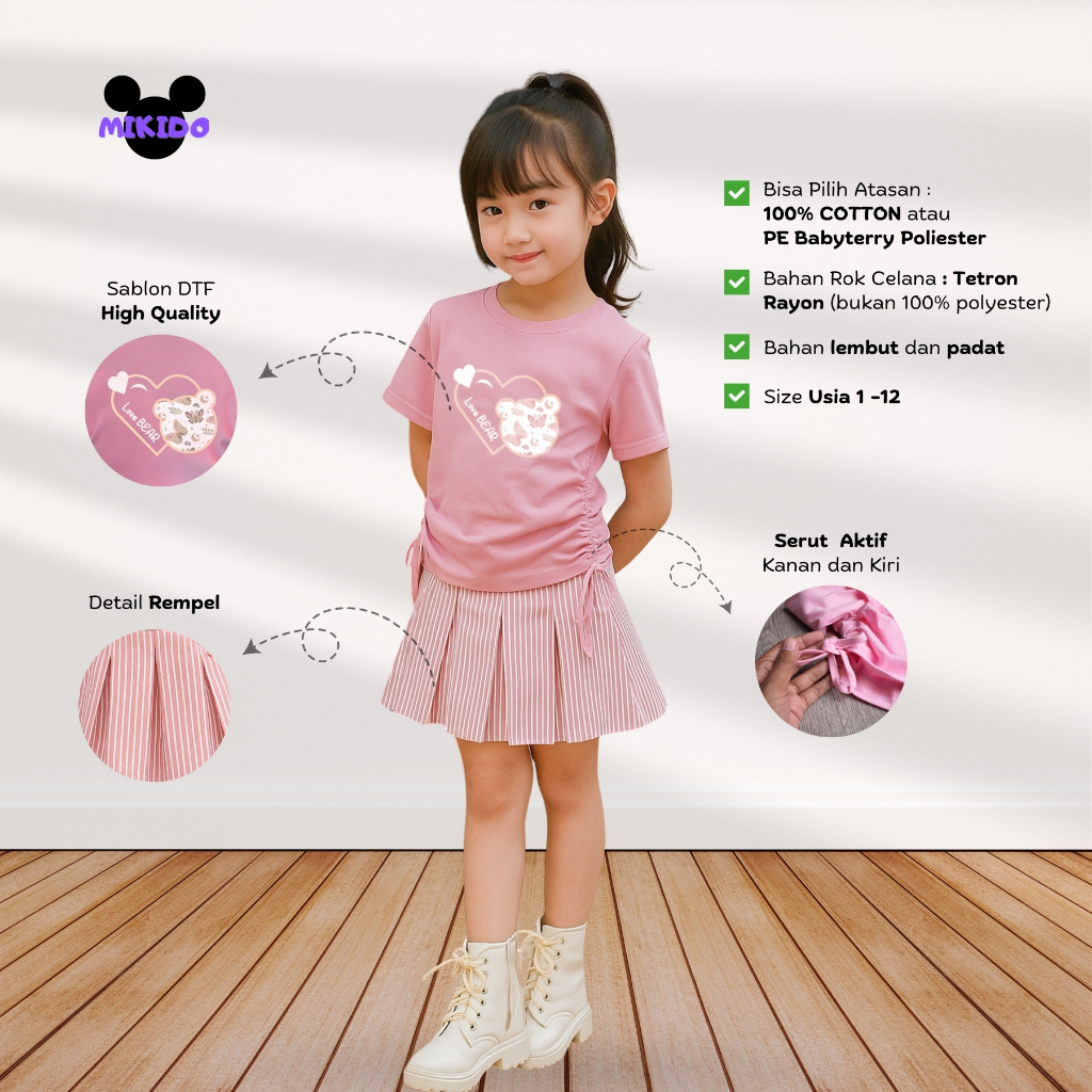 Setelan Kaos Serut Crop Top dan Rok Celana Rempel Salur Perempuan Love Bear Umur 1-14 tahun Part 2