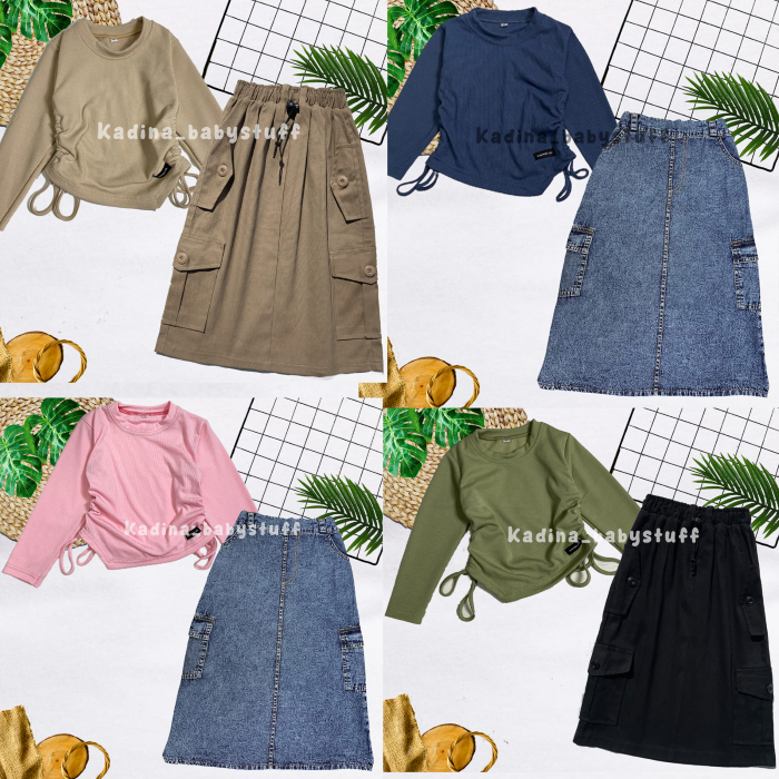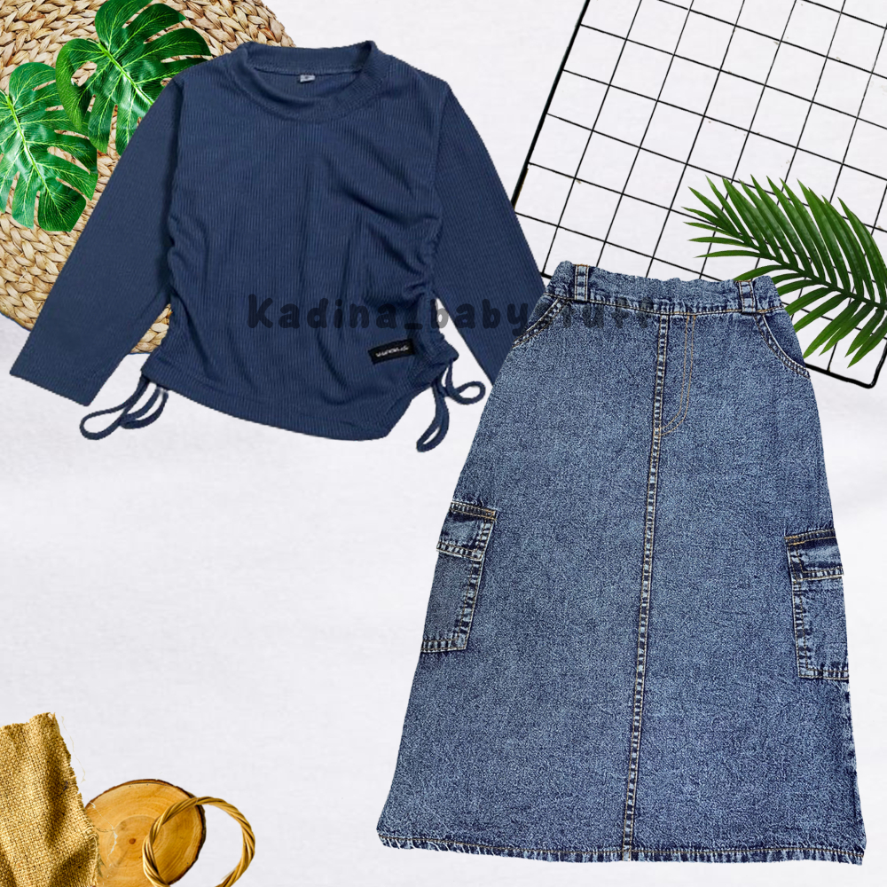 Setelan Anak Perempuan / Rok Kargo Jeans Anak dan Kaos Serut knit usia 2-12 tahun