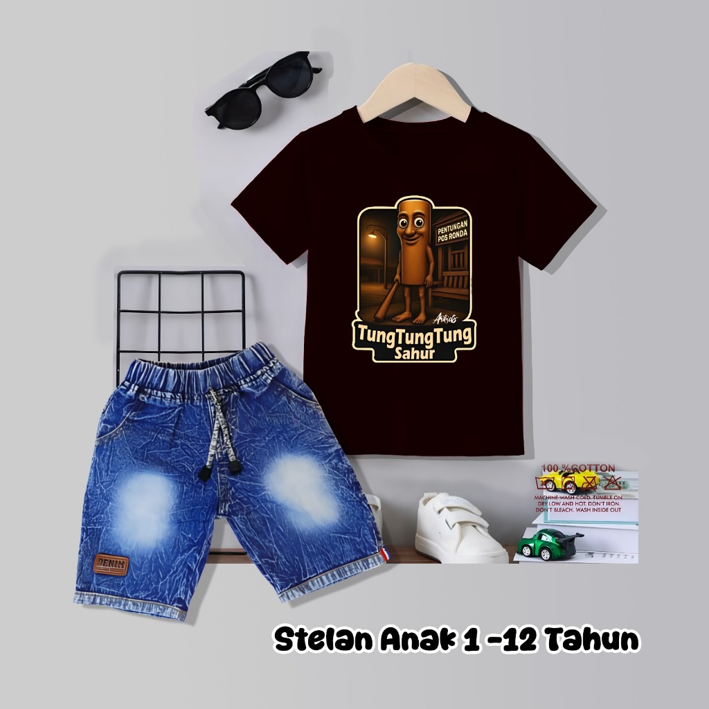 Setelan Anak Laki Laki Perempuan Usia 1-10Tahun One Set Atasan & Bawahan Celana Jeans Pendek
